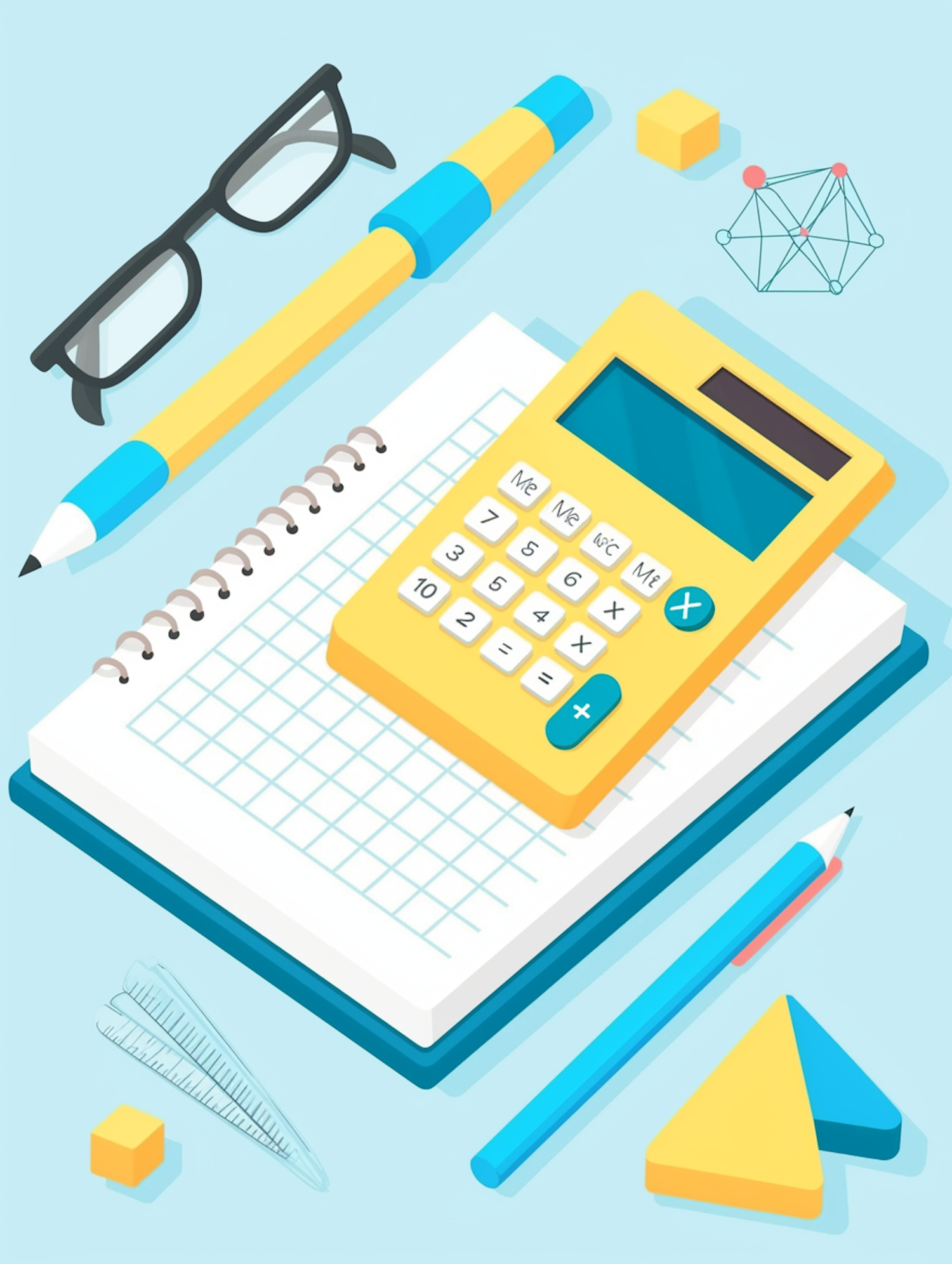 Bright illustration of school supplies like a calculator, notebook, pen, and glasses on a light blue background.