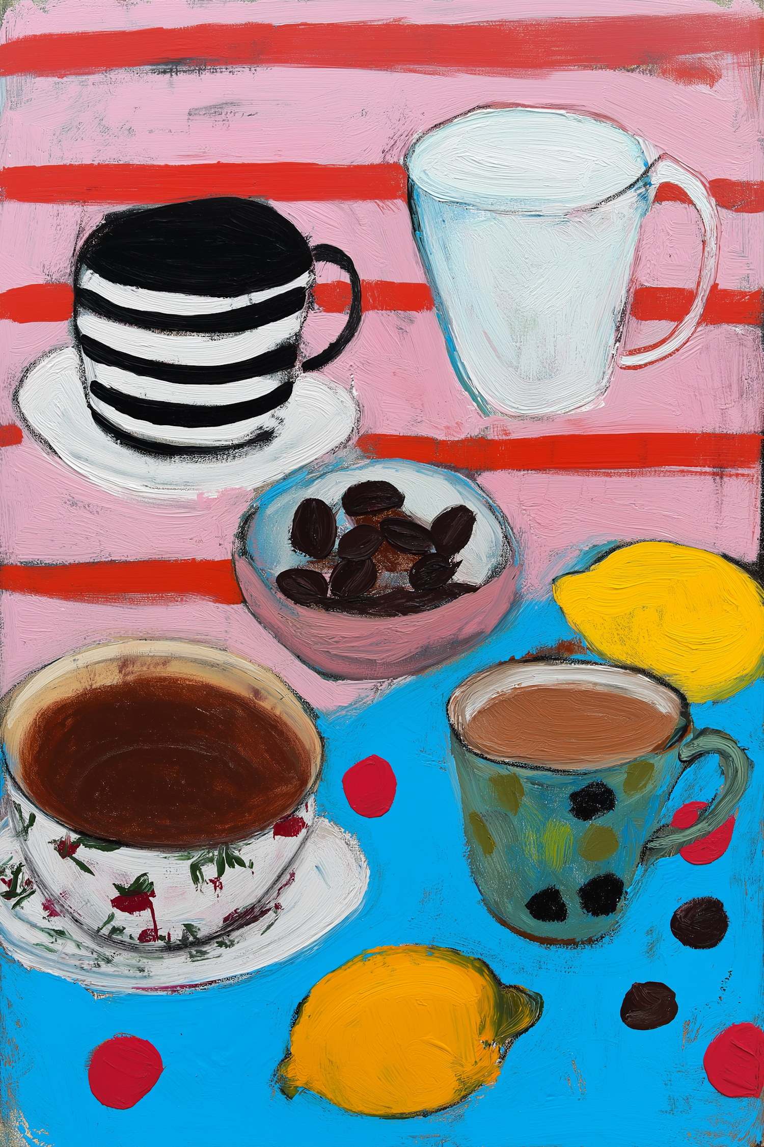 A colorful painting of cups, lemons, and coffee beans on a vibrant table with a striped background.