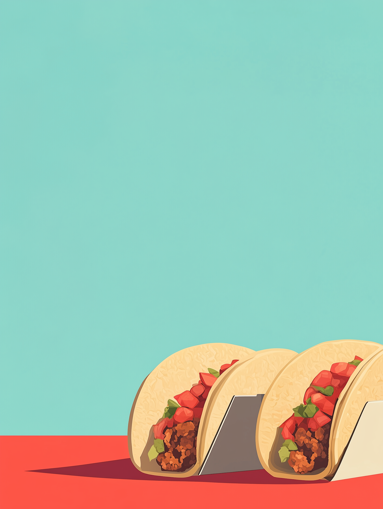 Stylized illustration of three tacos with vibrant fillings on a red surface against a teal background.