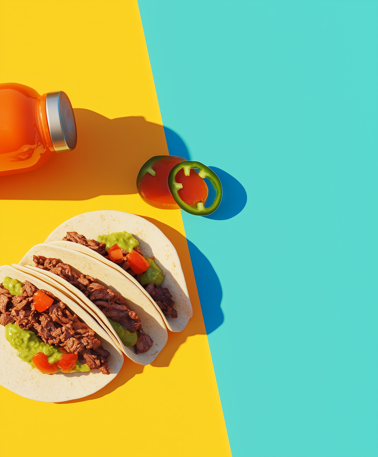 Colorful tacos with beef, guacamole, and tomatoes on a vibrant yellow and blue background with bell pepper slices.