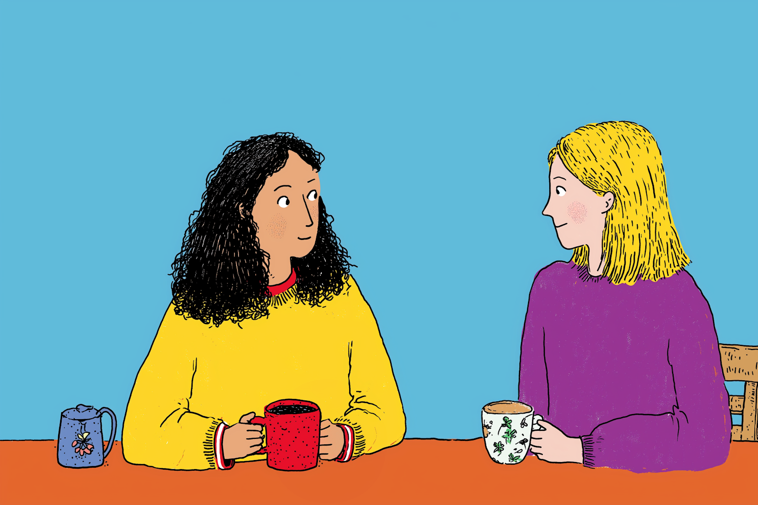 Two individuals sit at a table with colorful mugs, engaging in conversation against a vibrant blue background.