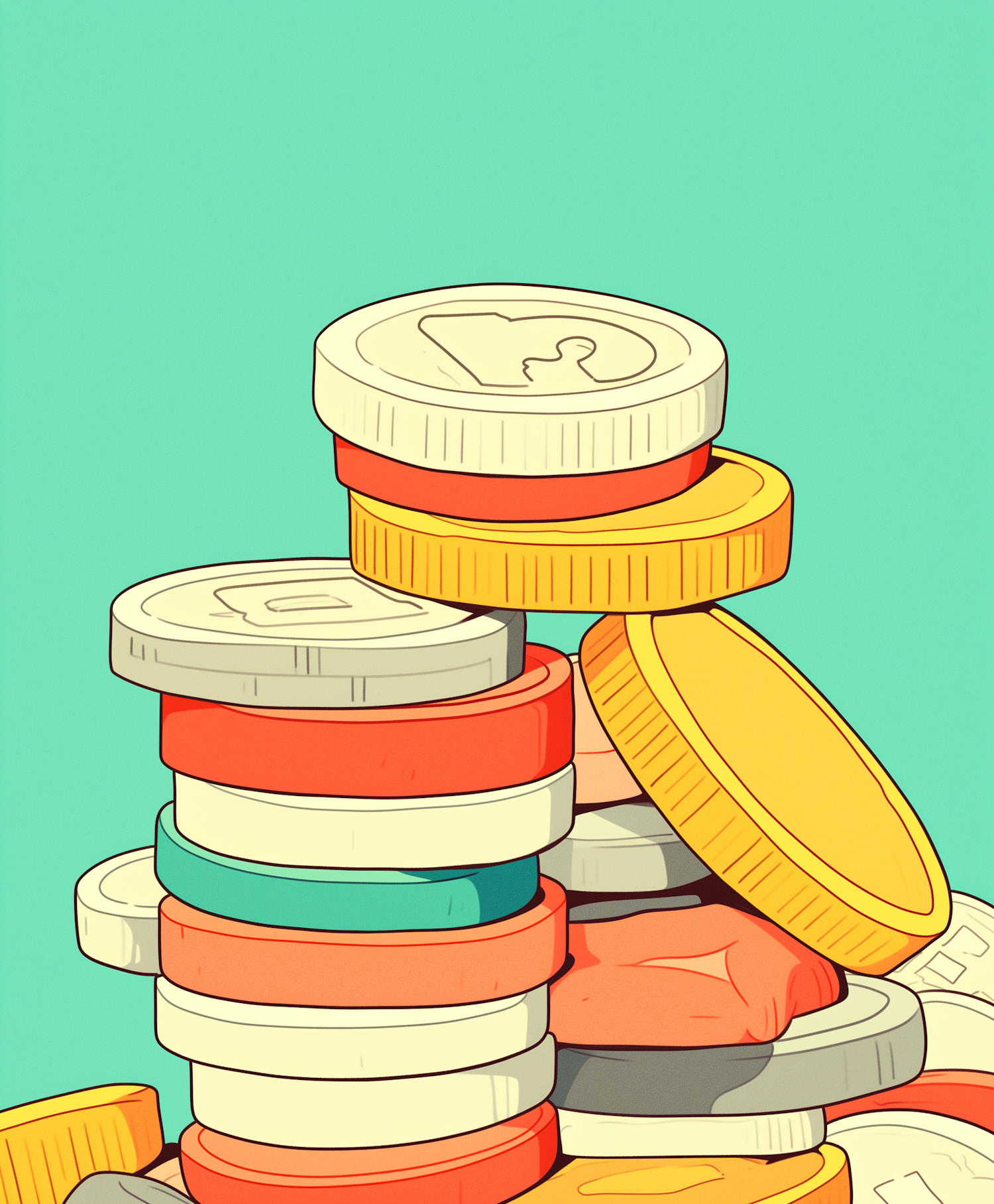 Stack of colorful coins in yellow, red, and white hues on a teal background, showcasing a playful and vibrant illustration.