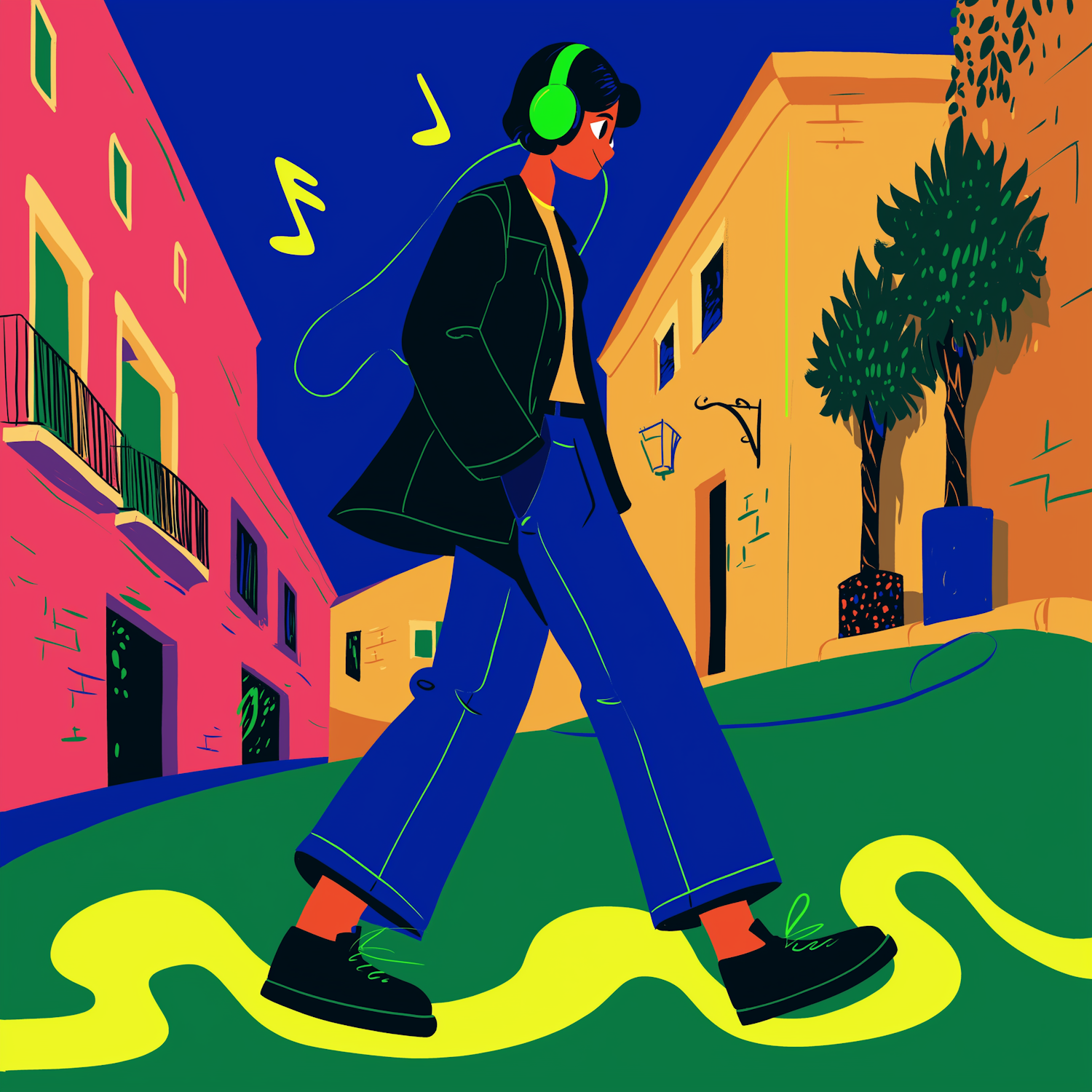 Colorful illustration of a person walking with headphones, surrounded by vibrant buildings and whimsical musical notes.