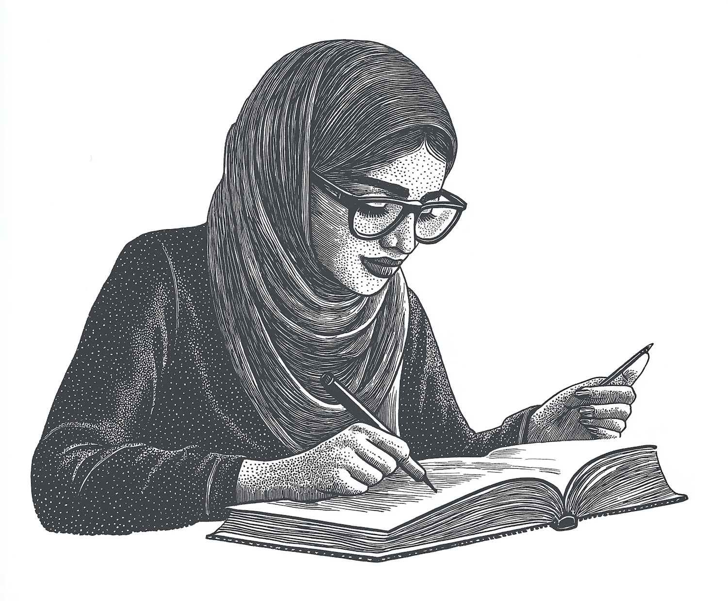 Illustration of a woman in a hijab and glasses writing in a book, showcasing focus and concentration.