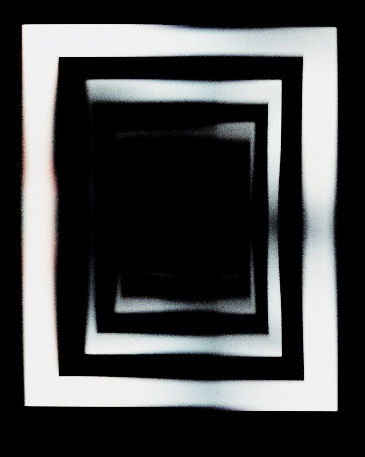 Concentric black and white squares create a tunnel-like optical illusion with depth and perspective.