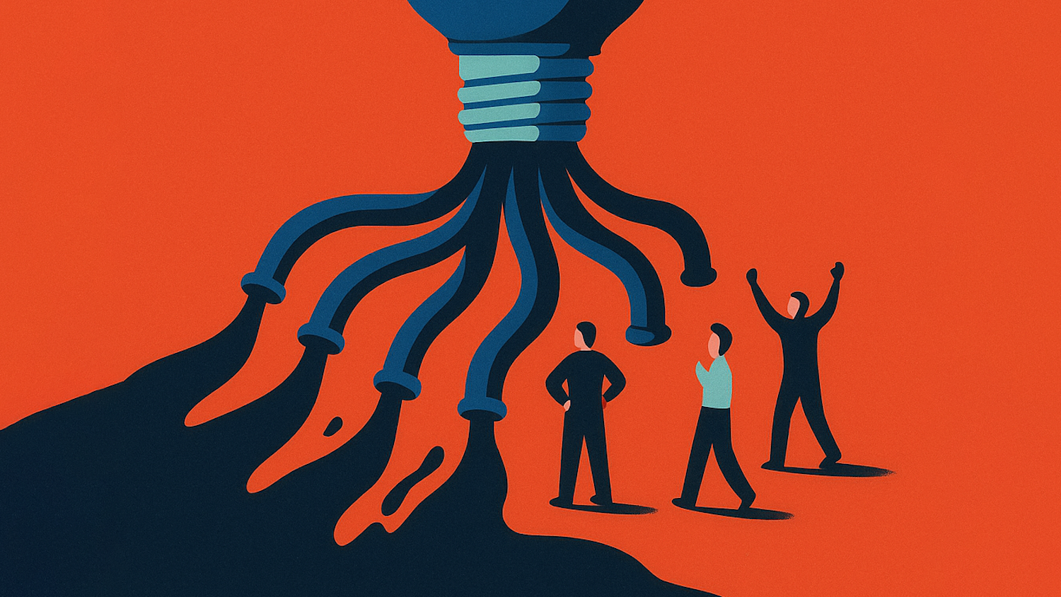 Bold illustration of a lightbulb with tentacle-like extensions and three figures interacting below on a vibrant orange background.