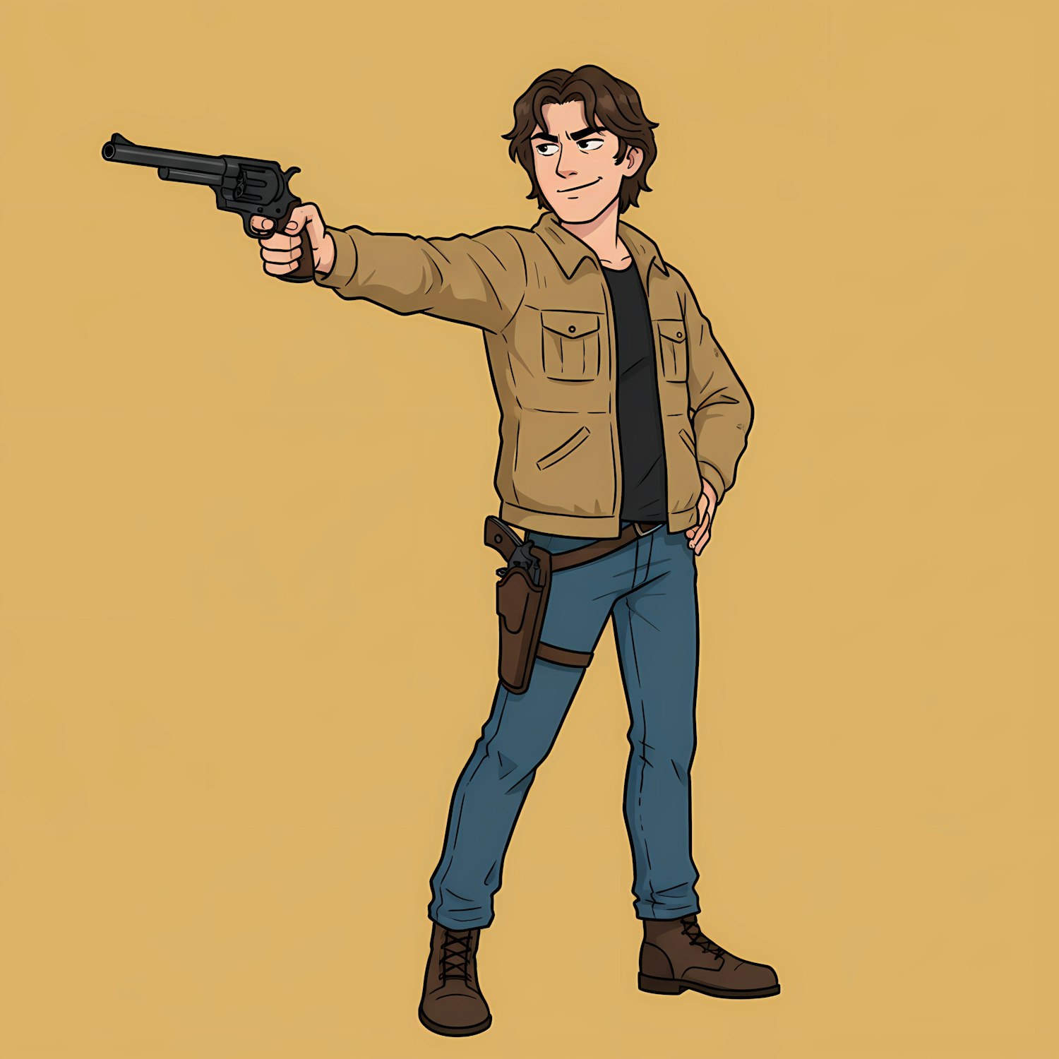 Cartoon illustration of a confident character holding a revolver, dressed in casual attire with a holster, against a plain background.