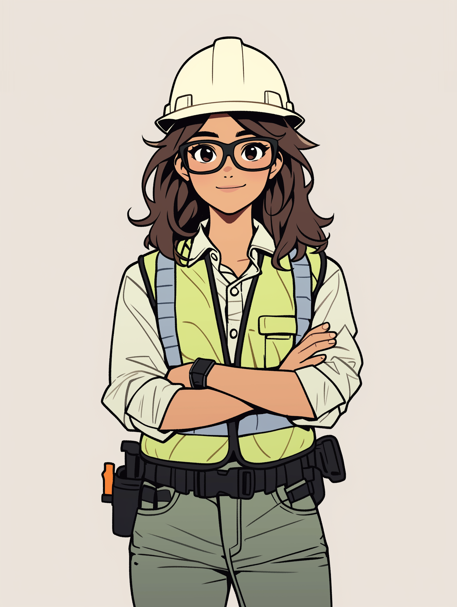 Confident construction worker with brown hair, helmet, and utility belt, arms crossed. Professional and authoritative stance.