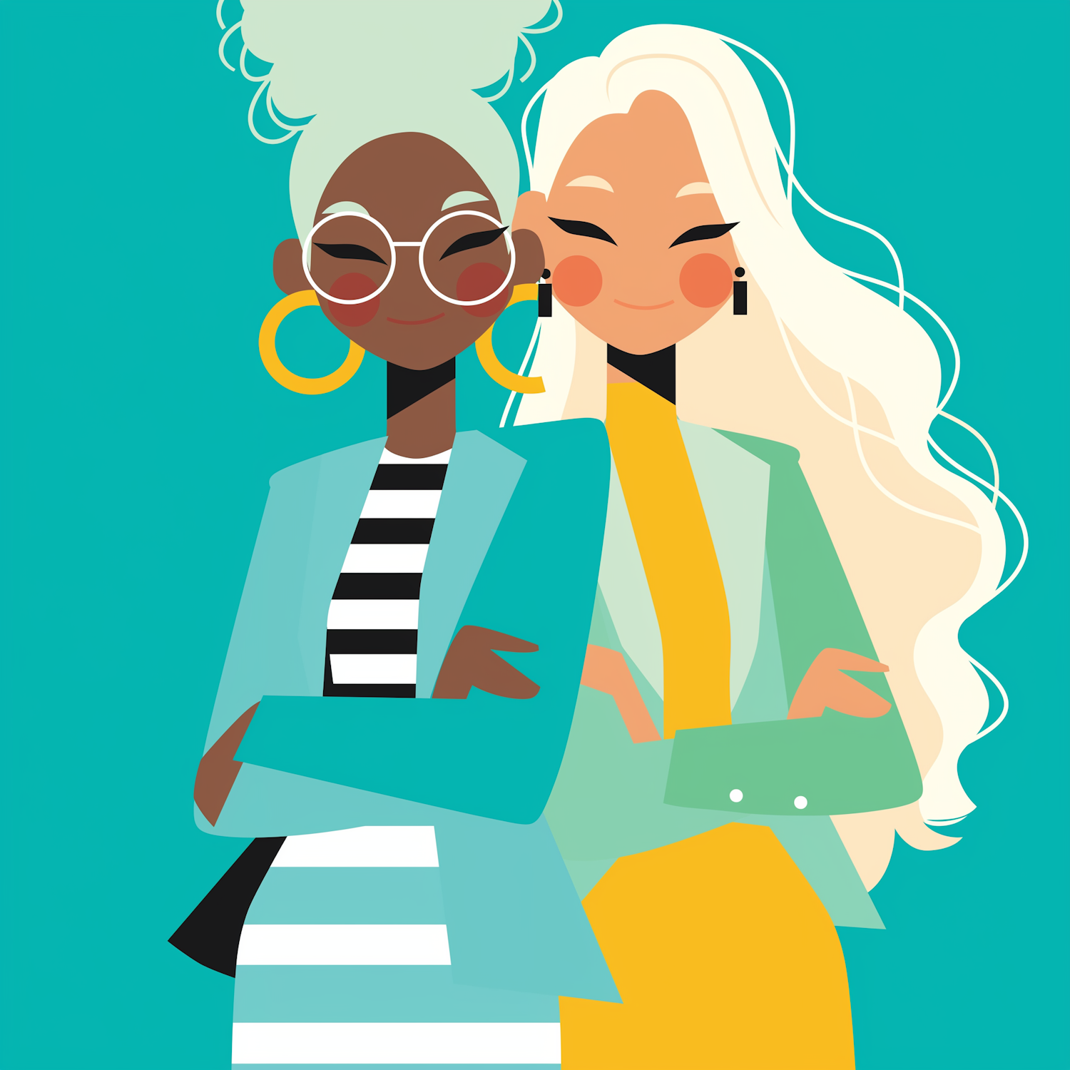Stylized illustration of two confident women with diverse appearances, wearing colorful blazers and smiling against a teal background.