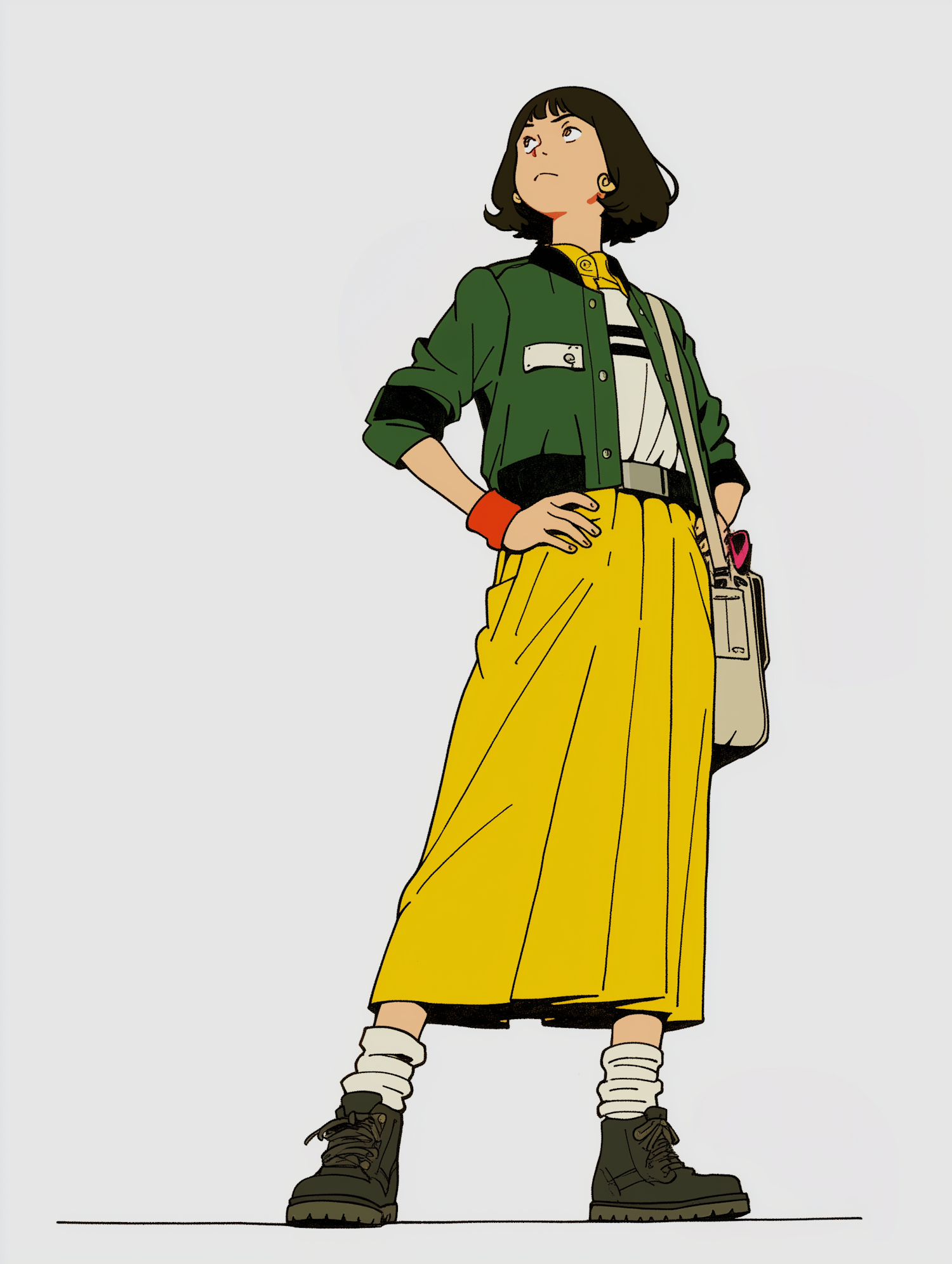 Stylized illustration of a confident woman in a green jacket, yellow skirt, and combat boots, standing in a heroic pose.