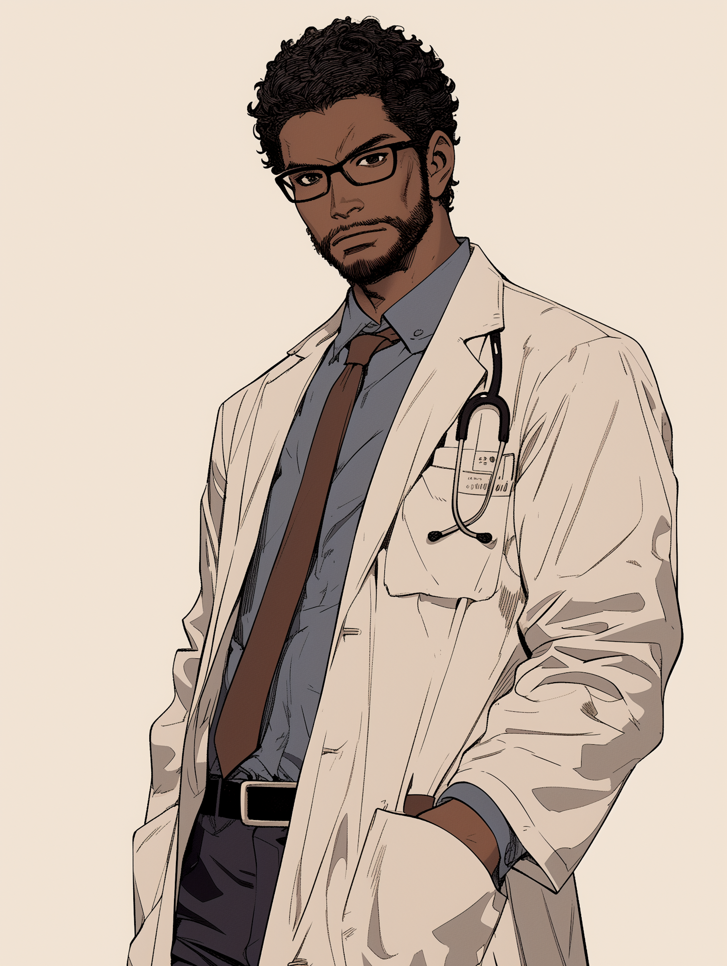 Illustration of a confident black male doctor with glasses, wearing a lab coat and stethoscope, exuding professionalism and approachability.