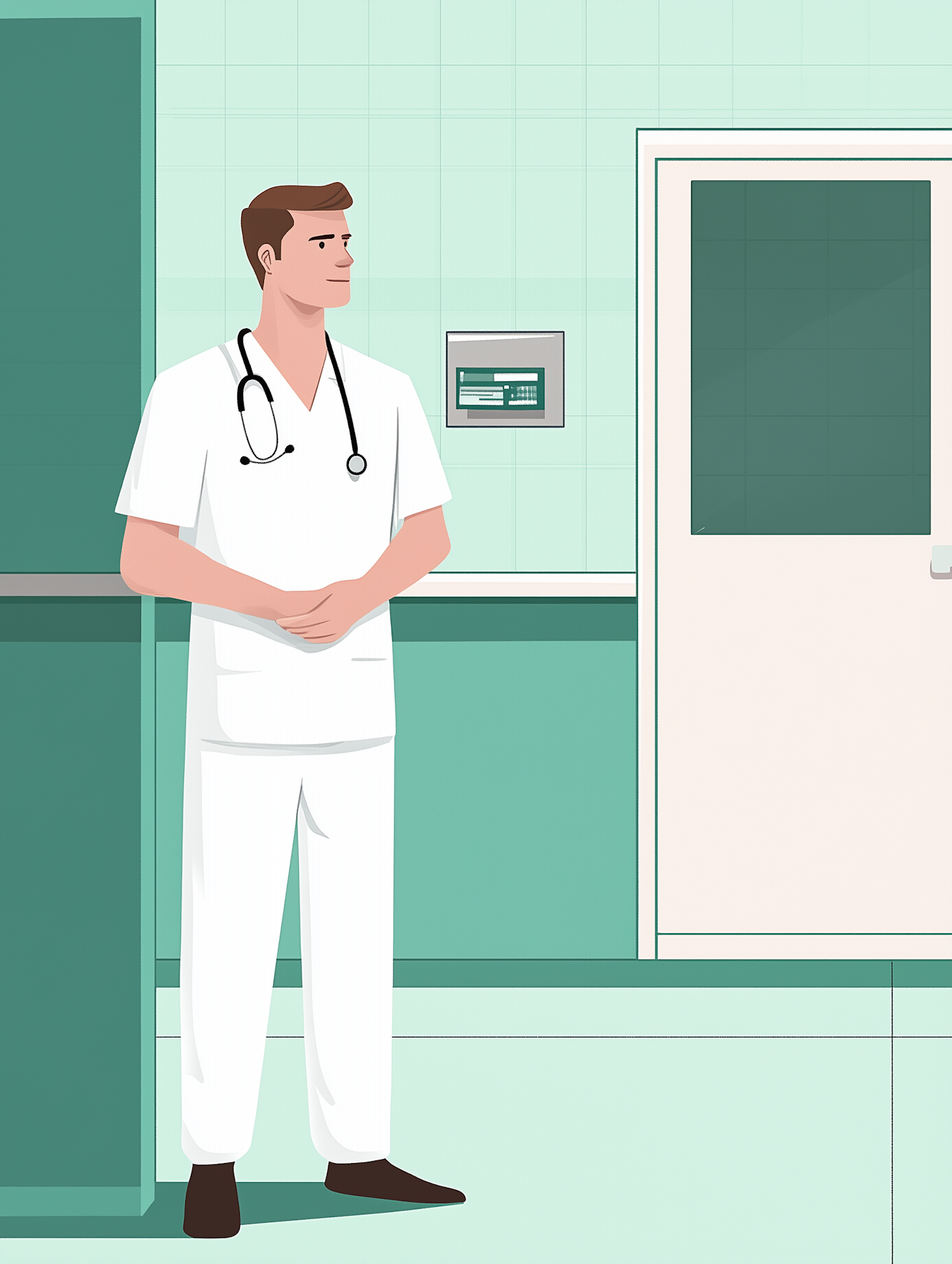 Illustration of a male doctor in a hospital corridor, wearing a white uniform and stethoscope, with a calm expression.