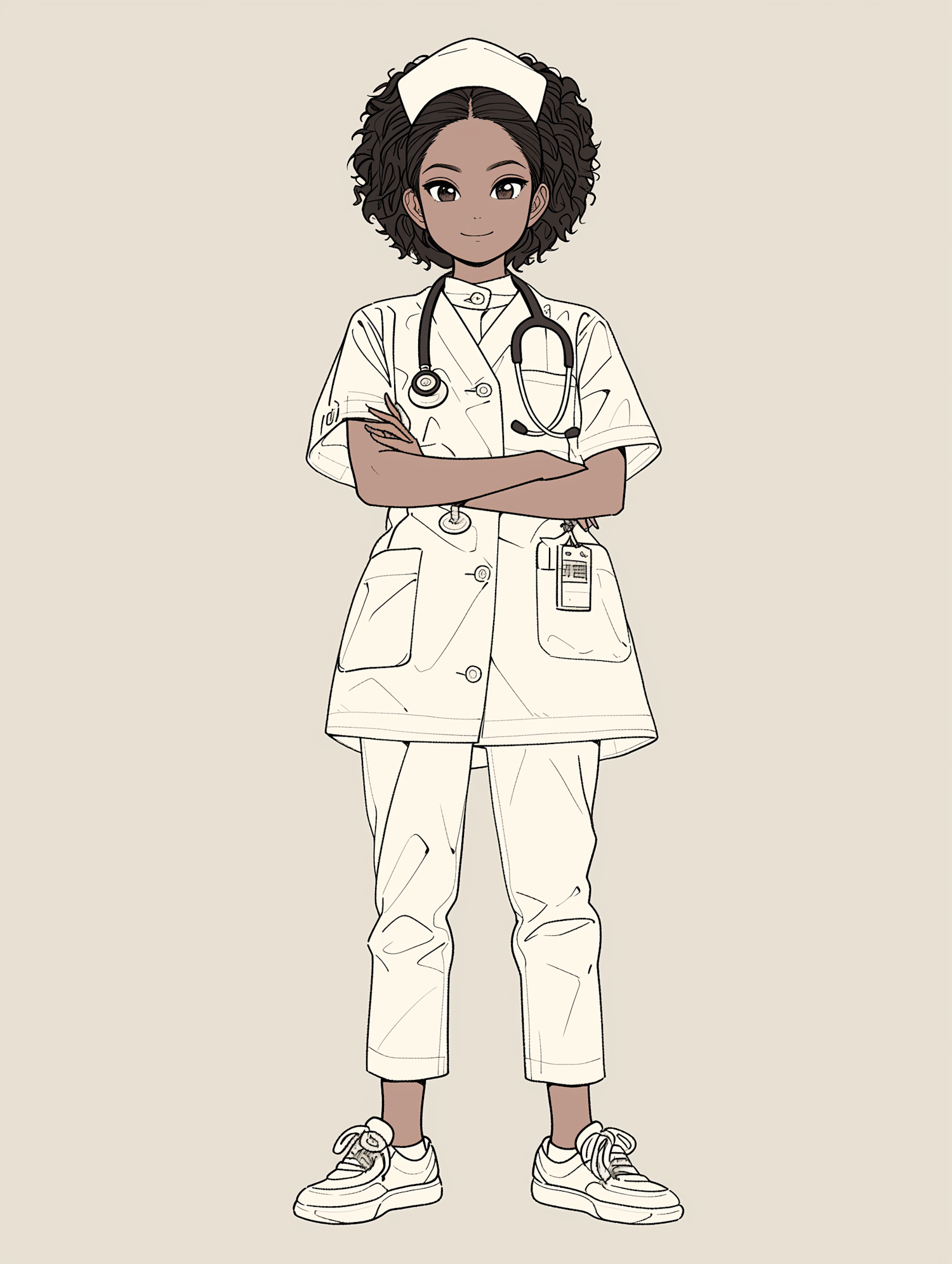 Illustration of a confident nurse with curly hair, wearing a white uniform and stethoscope, standing with arms crossed.