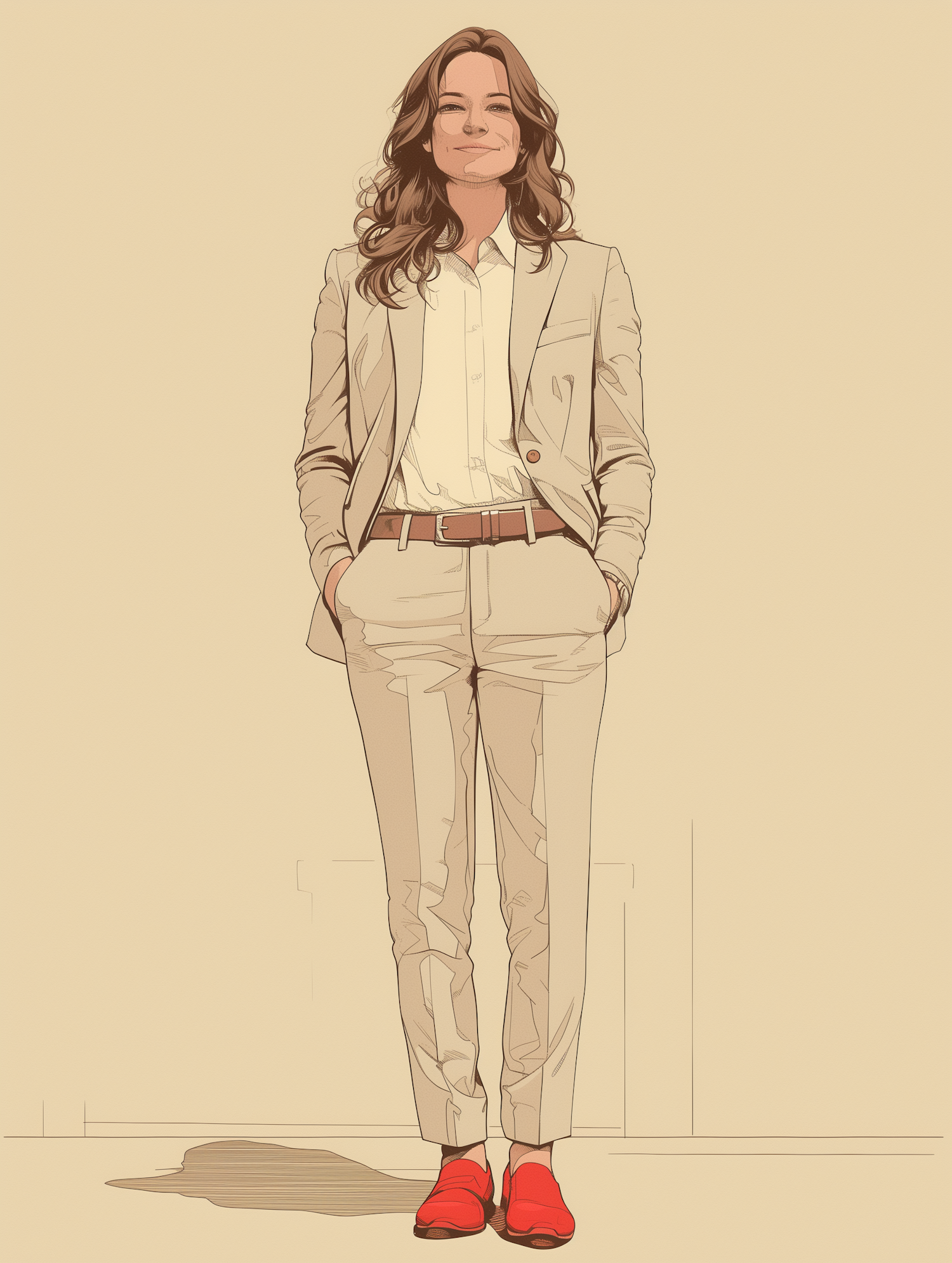 Illustration of a confident woman in a beige suit with red shoes, standing against a plain background, exuding style and professionalism.