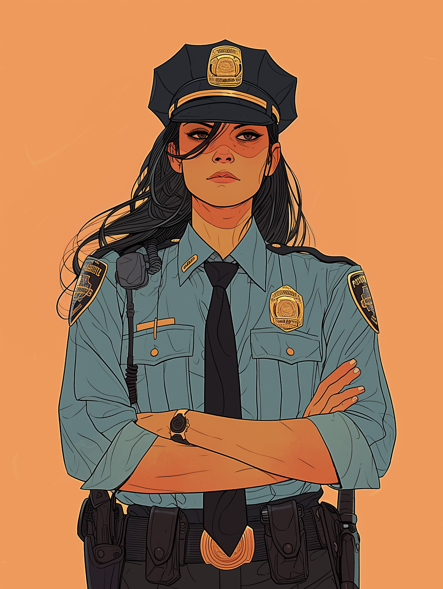 Illustration of a confident female police officer with long black hair, in uniform, against an orange background.