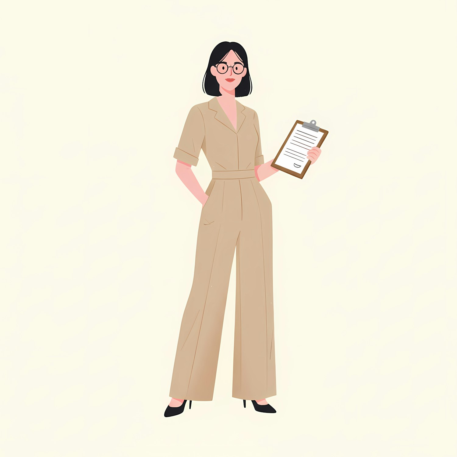Illustration of a woman in a beige jumpsuit holding a clipboard, exuding a professional and organized vibe.