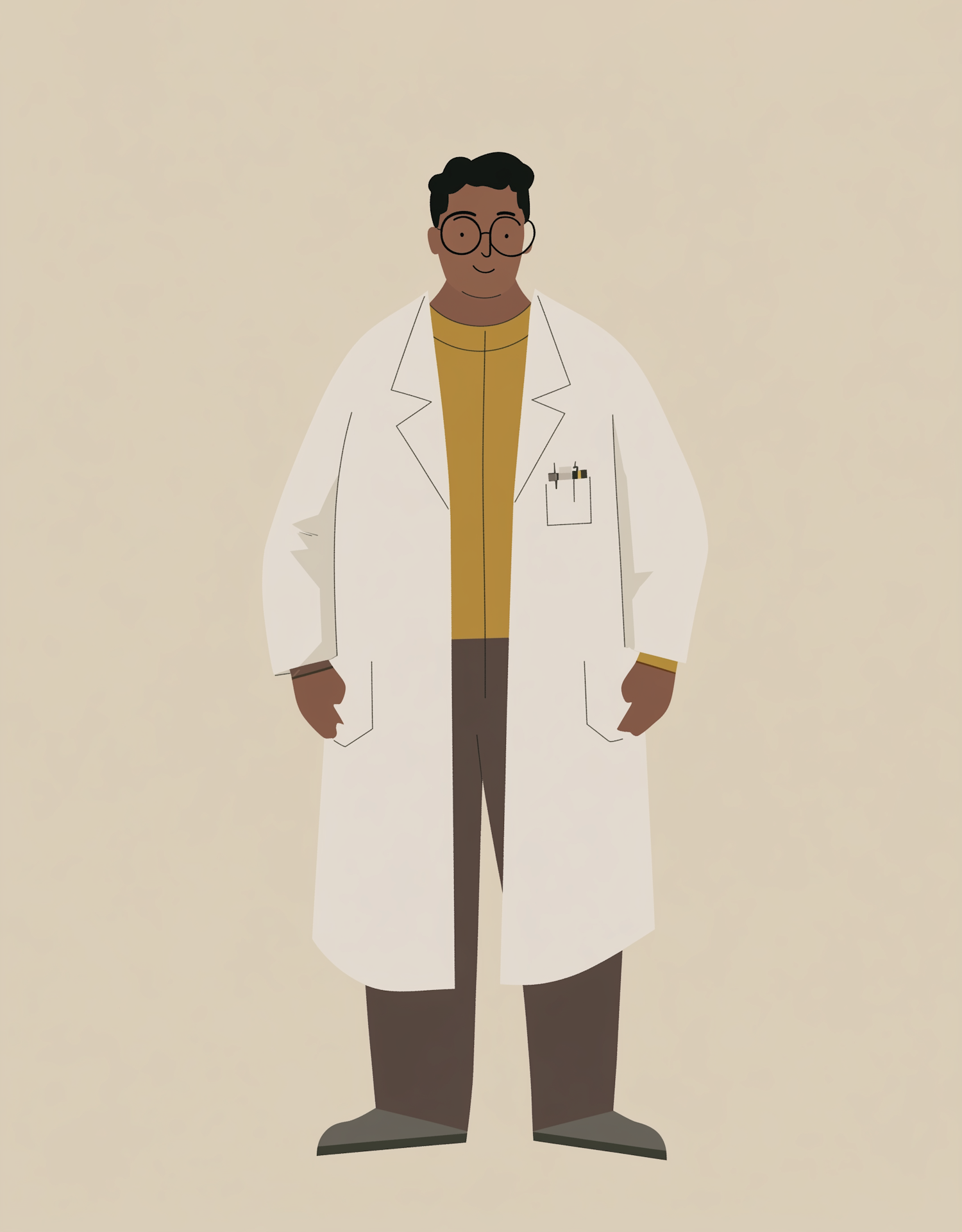 Cartoon illustration of a man in a lab coat with glasses, dark skin, and short hair, standing against a beige background.