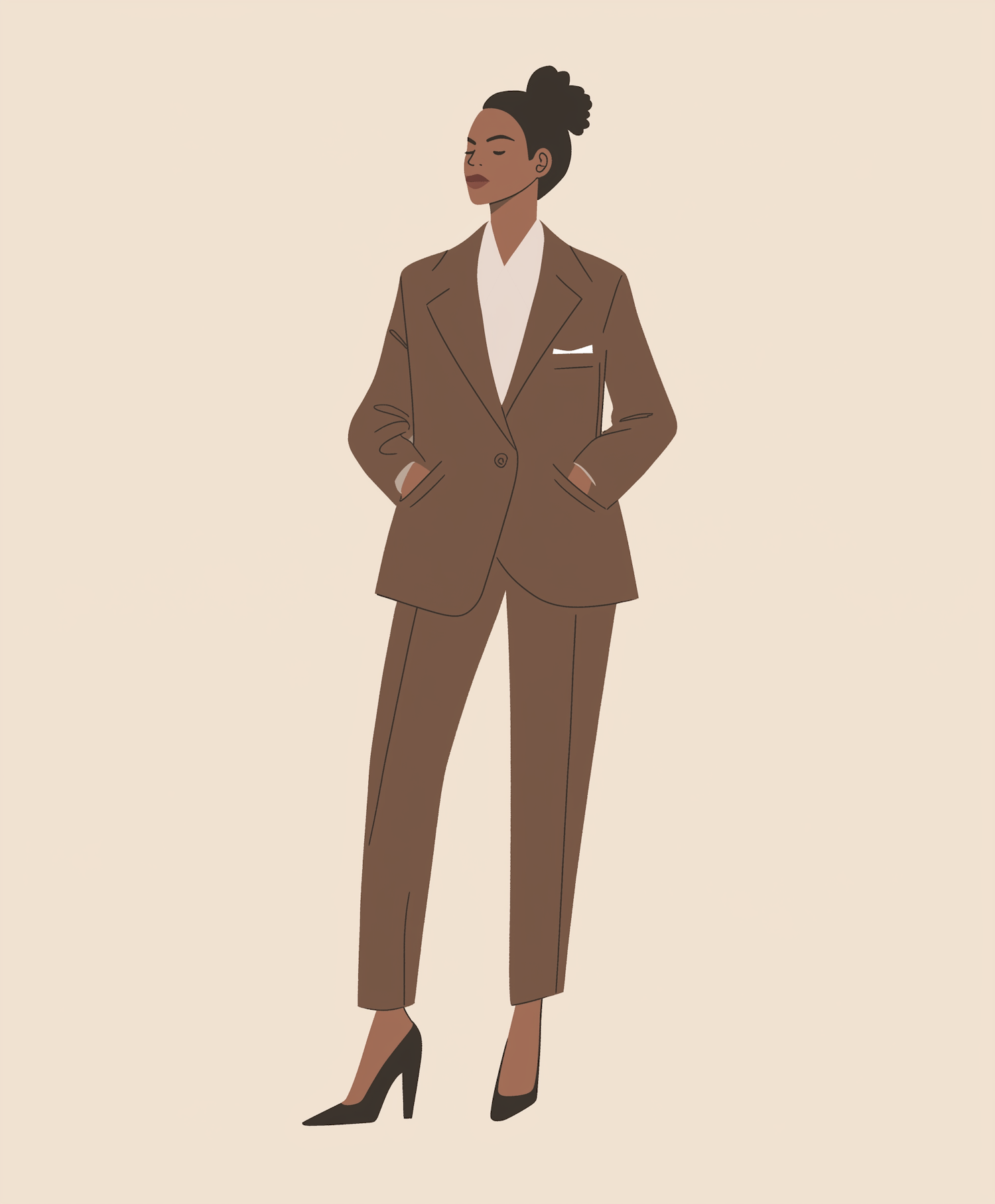 Illustration of a confident woman in a brown suit with a bun hairstyle, standing against a beige background.