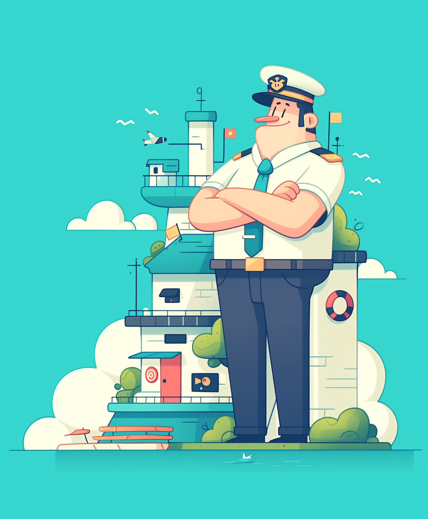 Cartoon ship captain with a confident pose in front of a stylized ship, set against a bright turquoise background.