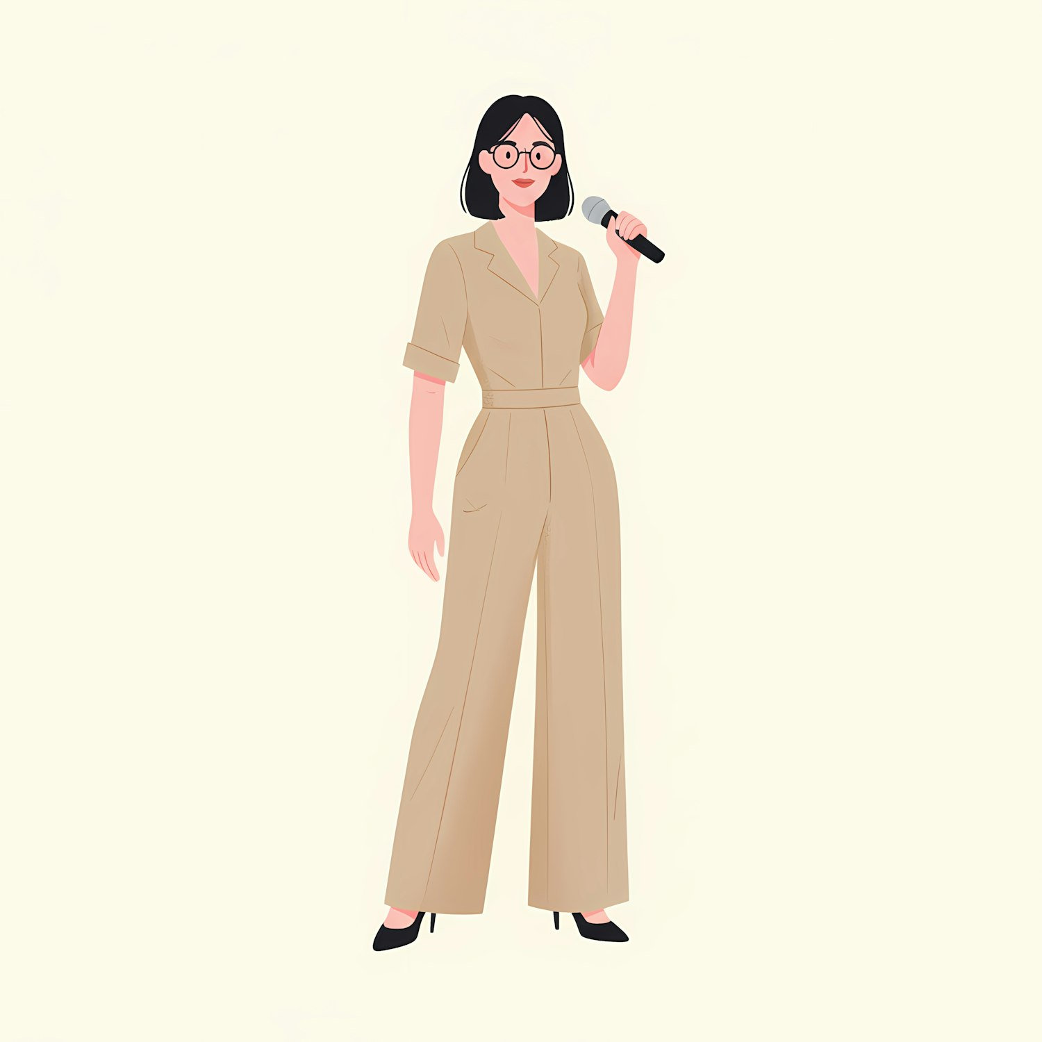 Illustration of a stylish woman in a beige jumpsuit holding a microphone, set against a light cream background.