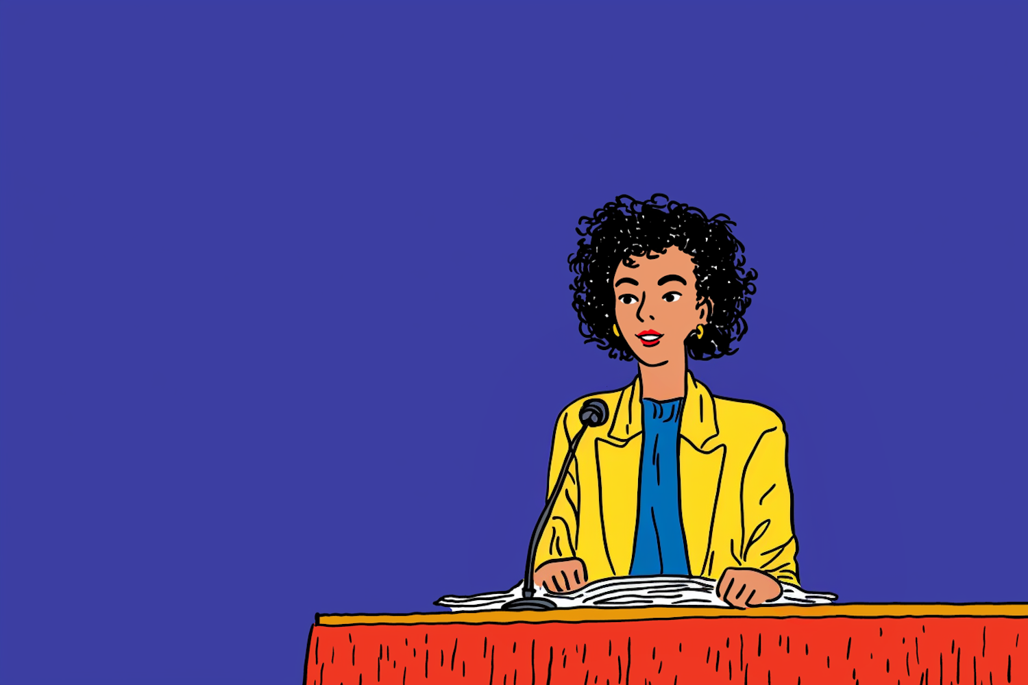 Illustration of a woman with curly hair in a yellow jacket speaking at a table with a microphone, set against a bold blue background.