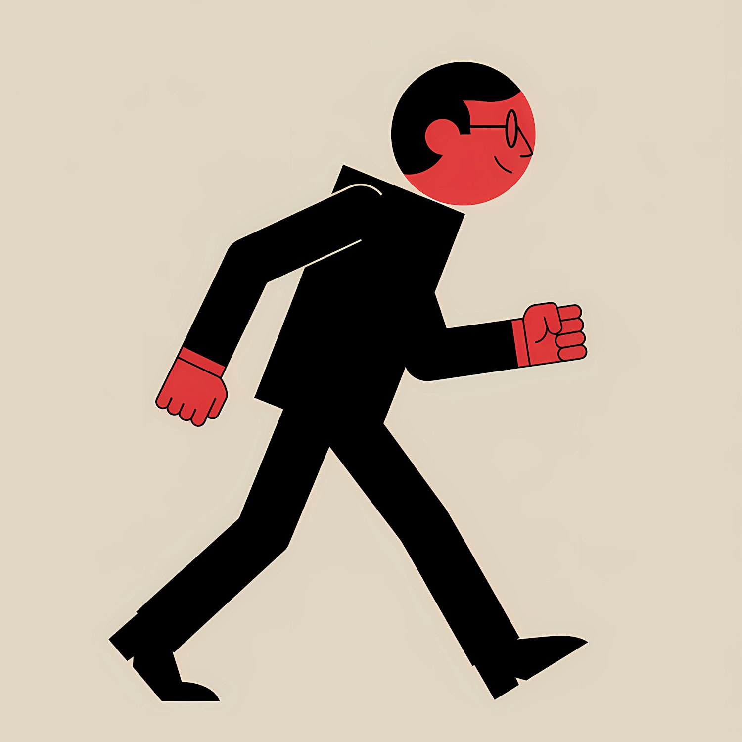 Minimalist illustration of a person walking confidently, wearing a black suit with red accents, set against a beige background.