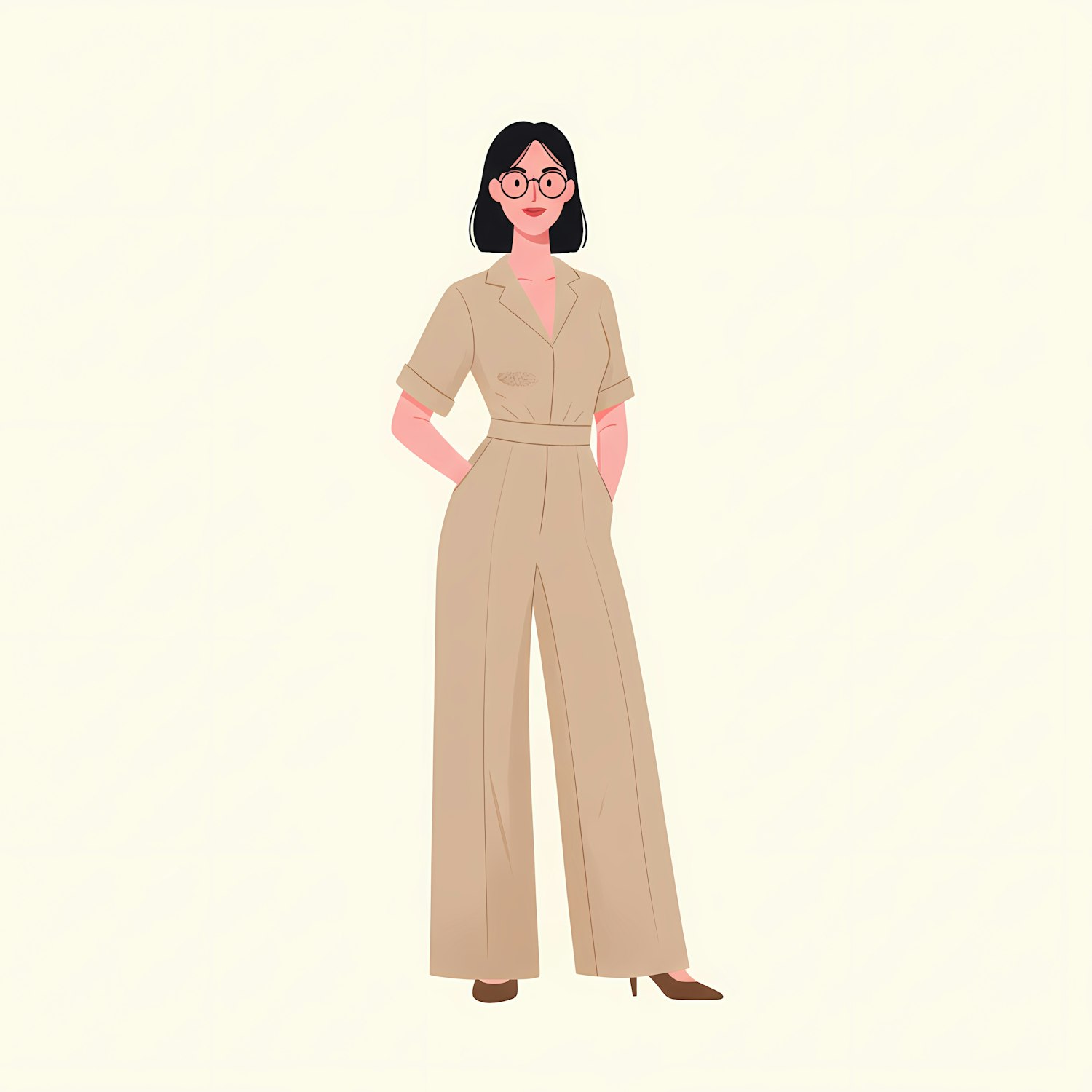 Stylized illustration of a woman in a beige jumpsuit with glasses and short black hair, standing confidently against a light background.