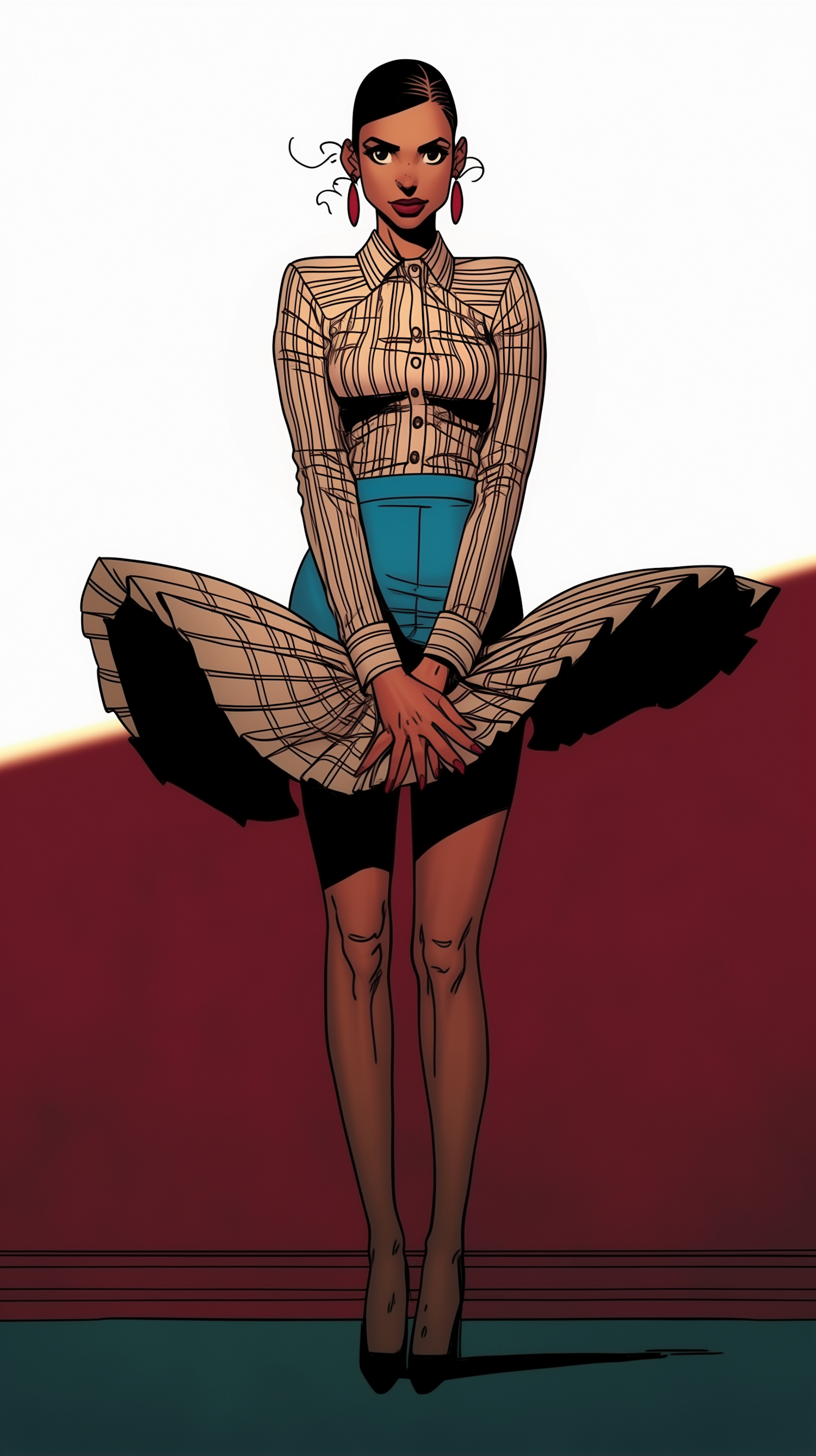Stylish illustration of a woman in a plaid shirt and blue skirt, standing confidently against a red and white background.