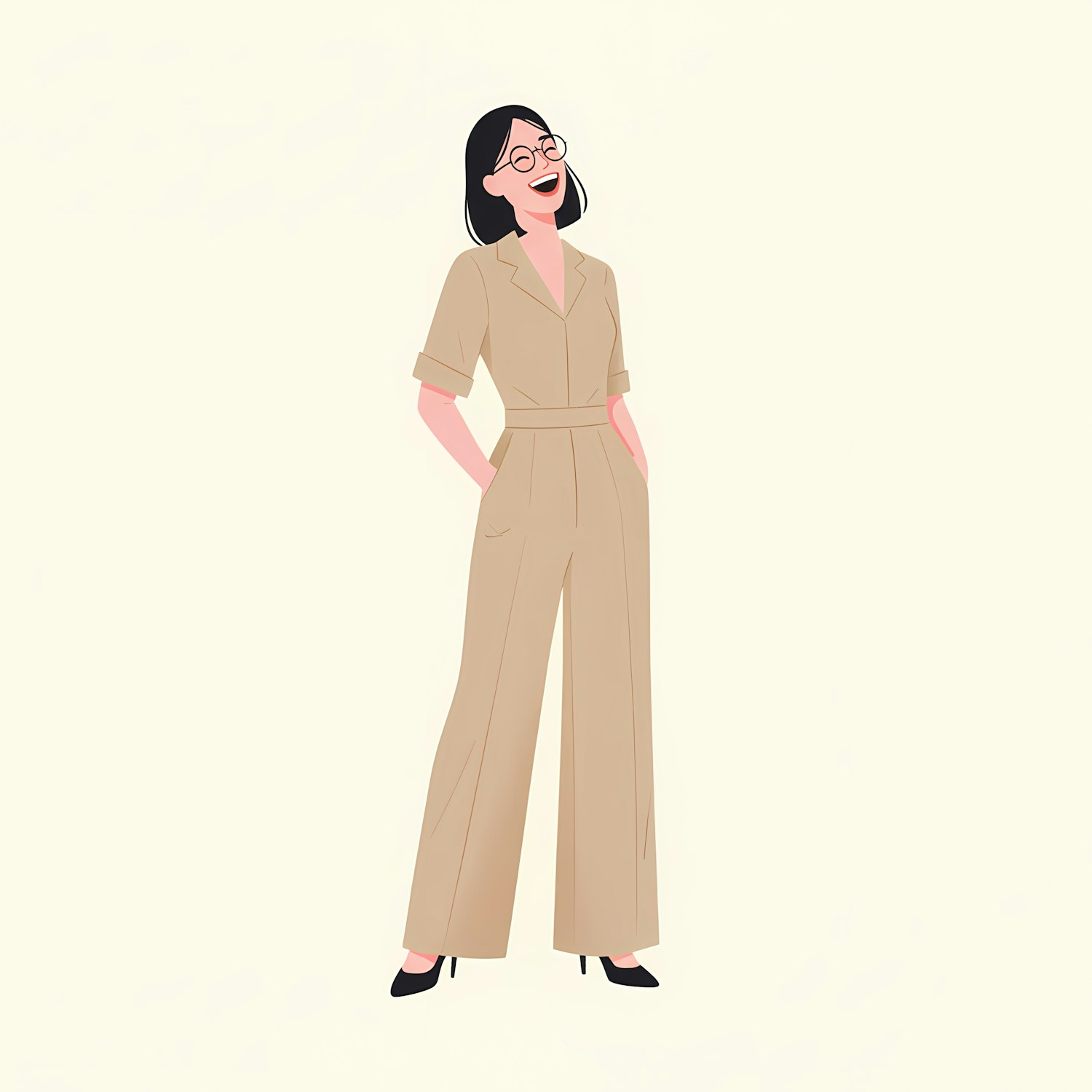 Stylized illustration of a cheerful woman in a beige jumpsuit and glasses, standing confidently against a light background.