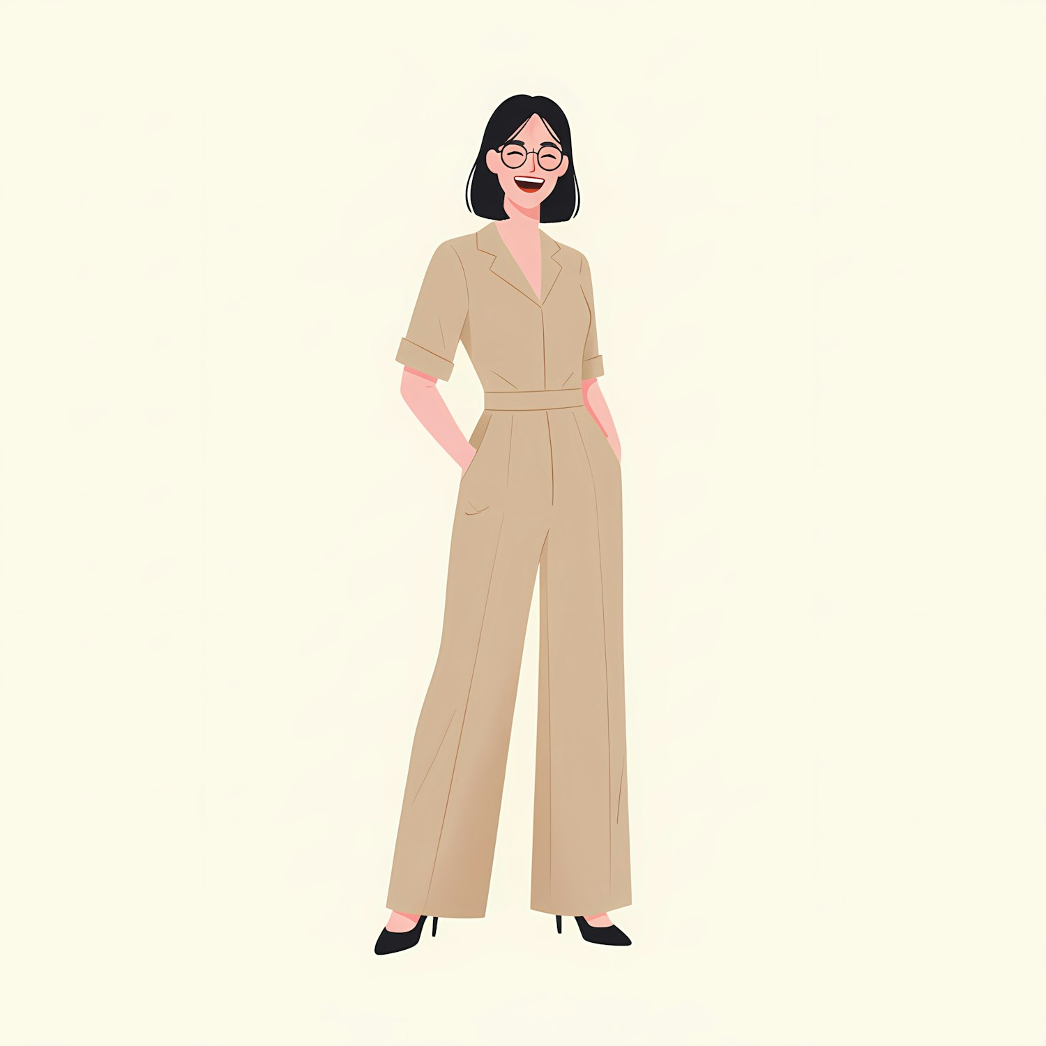 Stylish illustration of a woman in a beige jumpsuit, smiling confidently with hands in pockets, set against a light background.