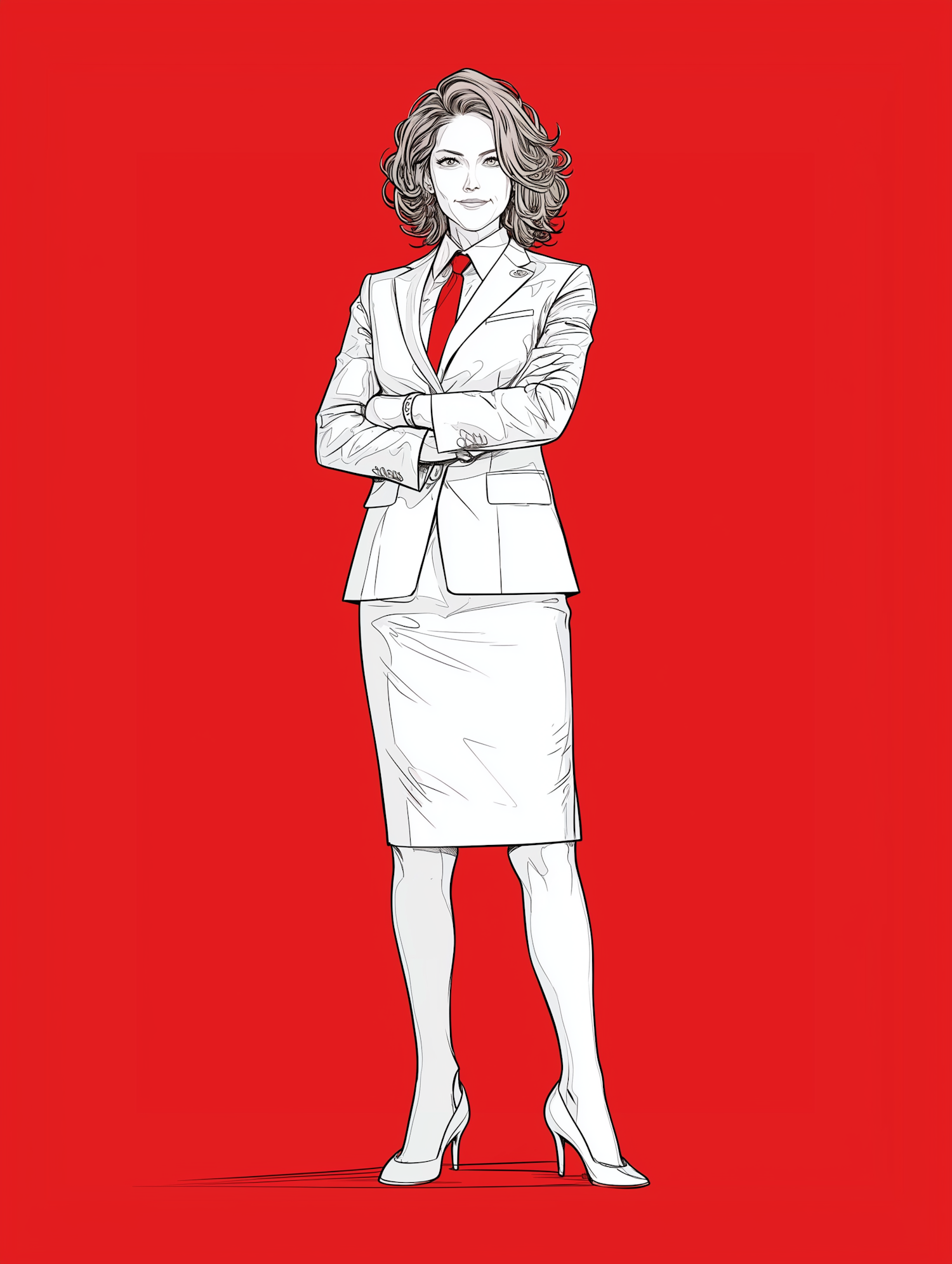 Illustration of a confident woman in a white suit with a red tie, standing against a bold red background.