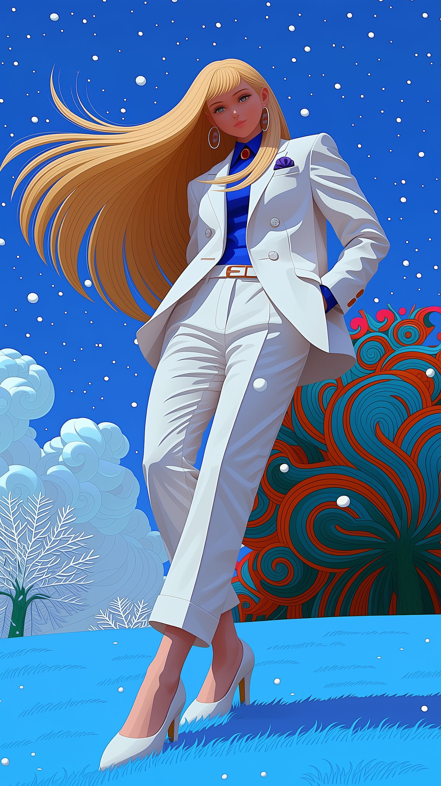 Stylized illustration of a woman in a white suit with blonde hair, standing in a snowy, vibrant outdoor setting.