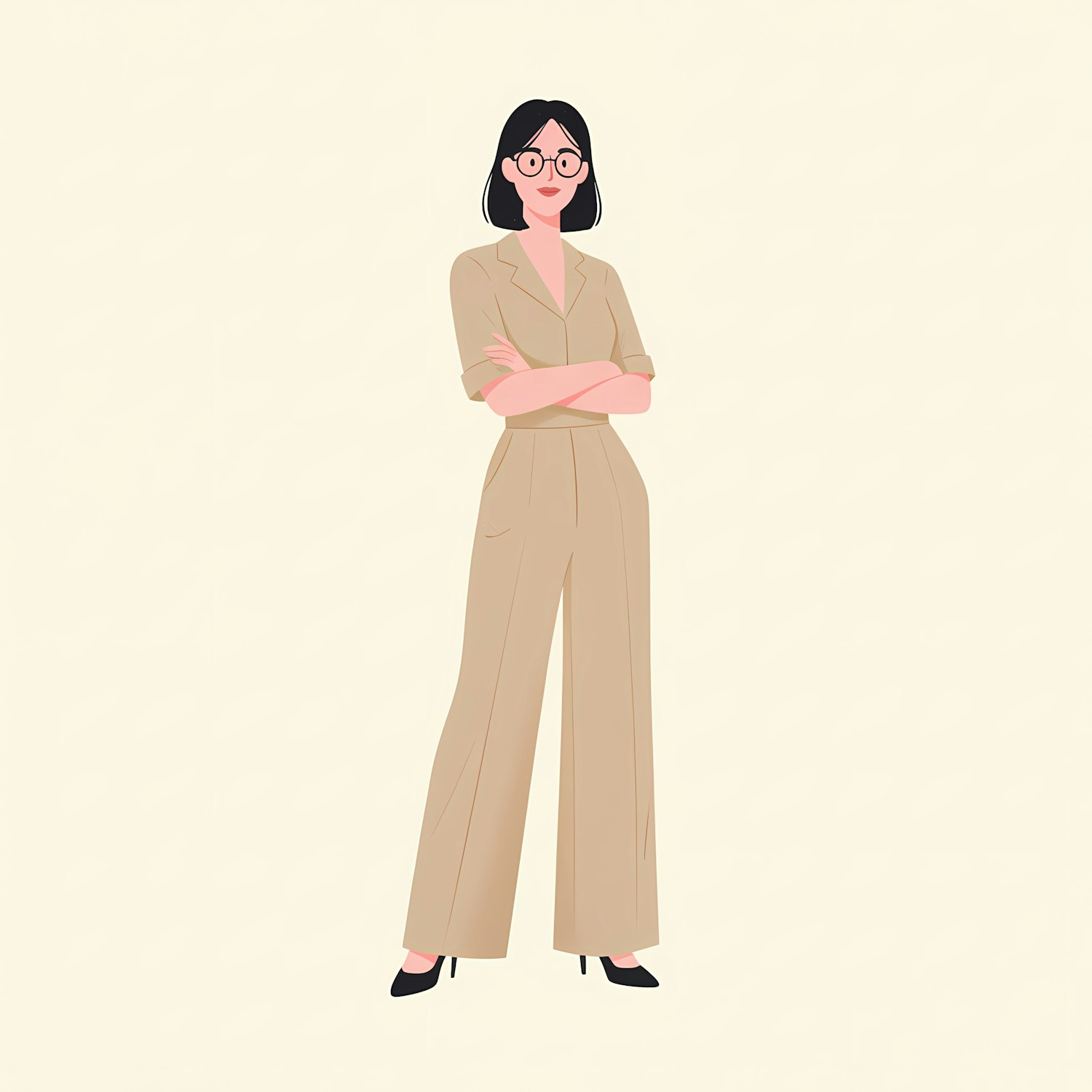 Stylish illustration of a woman in a beige jumpsuit and glasses, standing confidently against a light background.