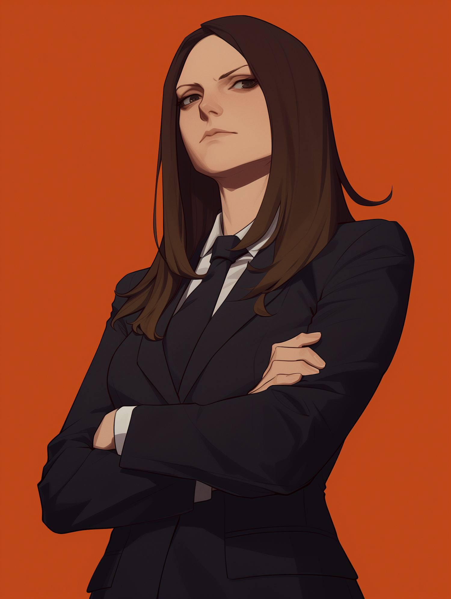 Stylized illustration of a confident woman in a black suit against a bold orange background, exuding professionalism and determination.
