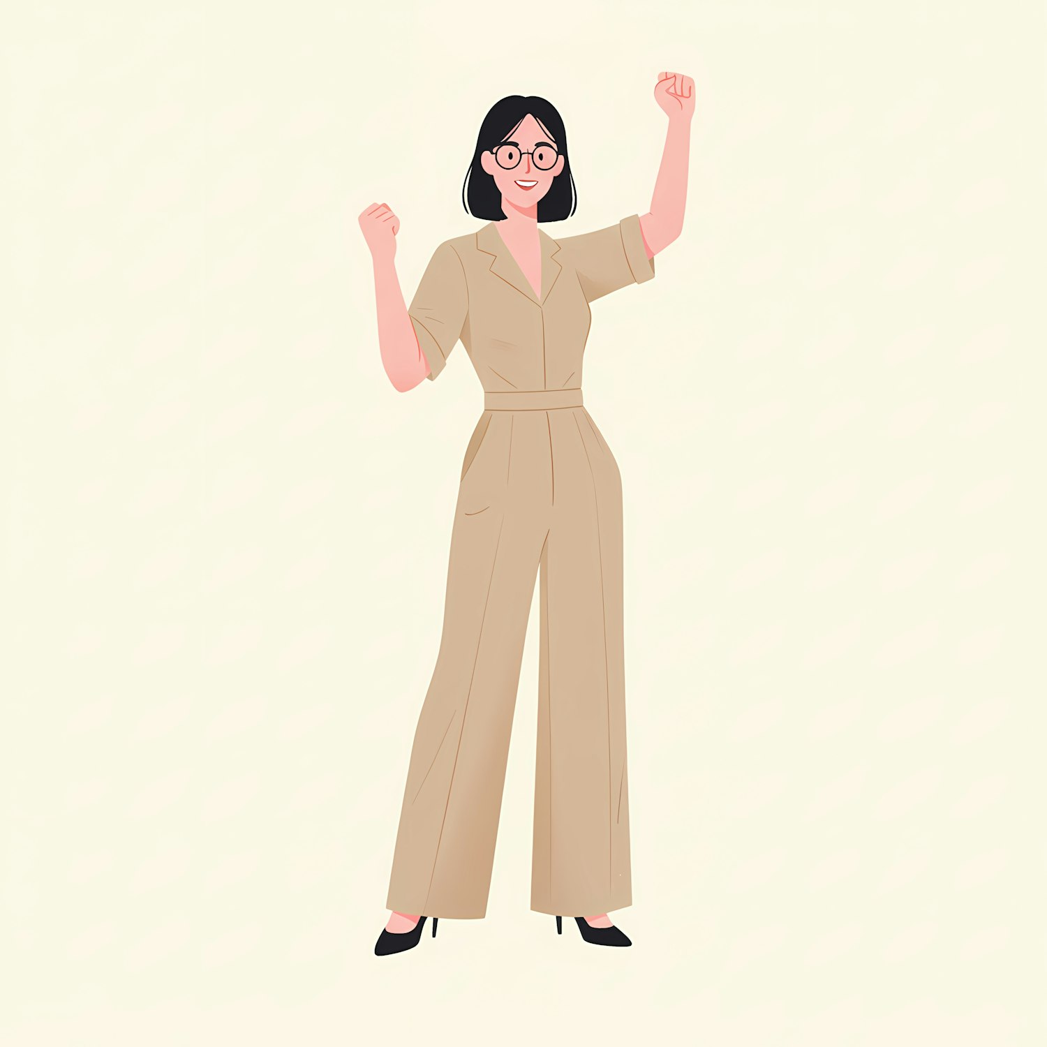 Illustration of a confident woman in a beige jumpsuit and glasses, raising her arms in celebration against a light background.