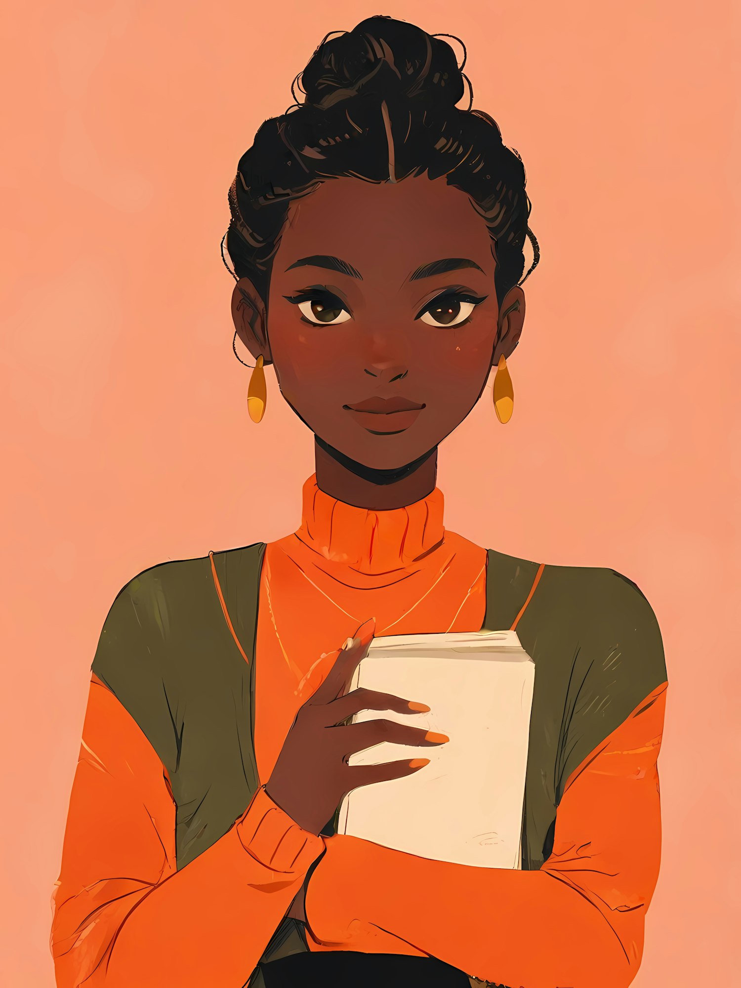 Illustration of a young Black woman holding a book, wearing an orange turtleneck and gold earrings, set against a peach background.