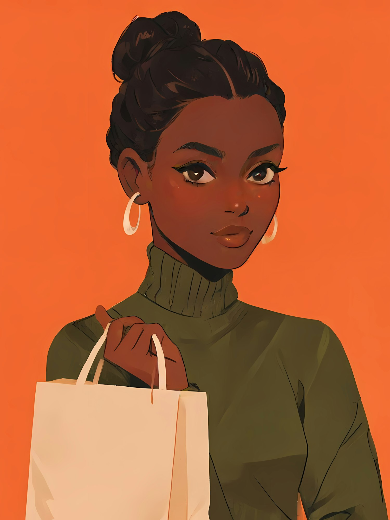 Stylish illustration of a woman with a shopping bag against a vibrant orange background, exuding confidence and modernity.