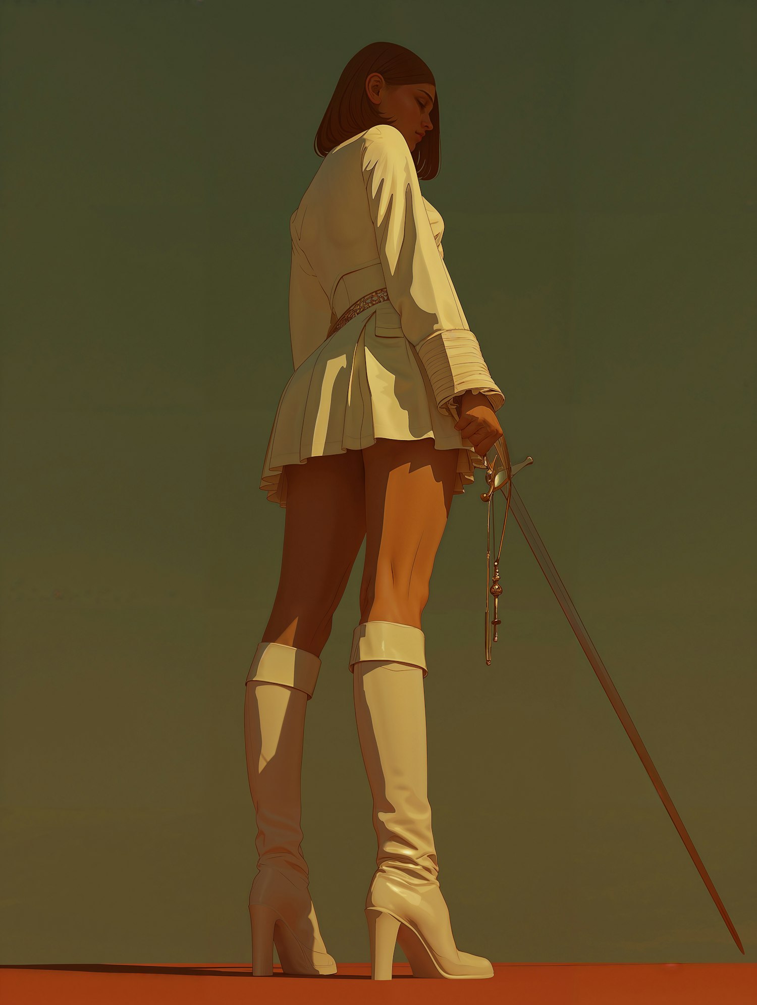 A woman in a white dress and boots holds a sword, standing confidently against a muted green background.