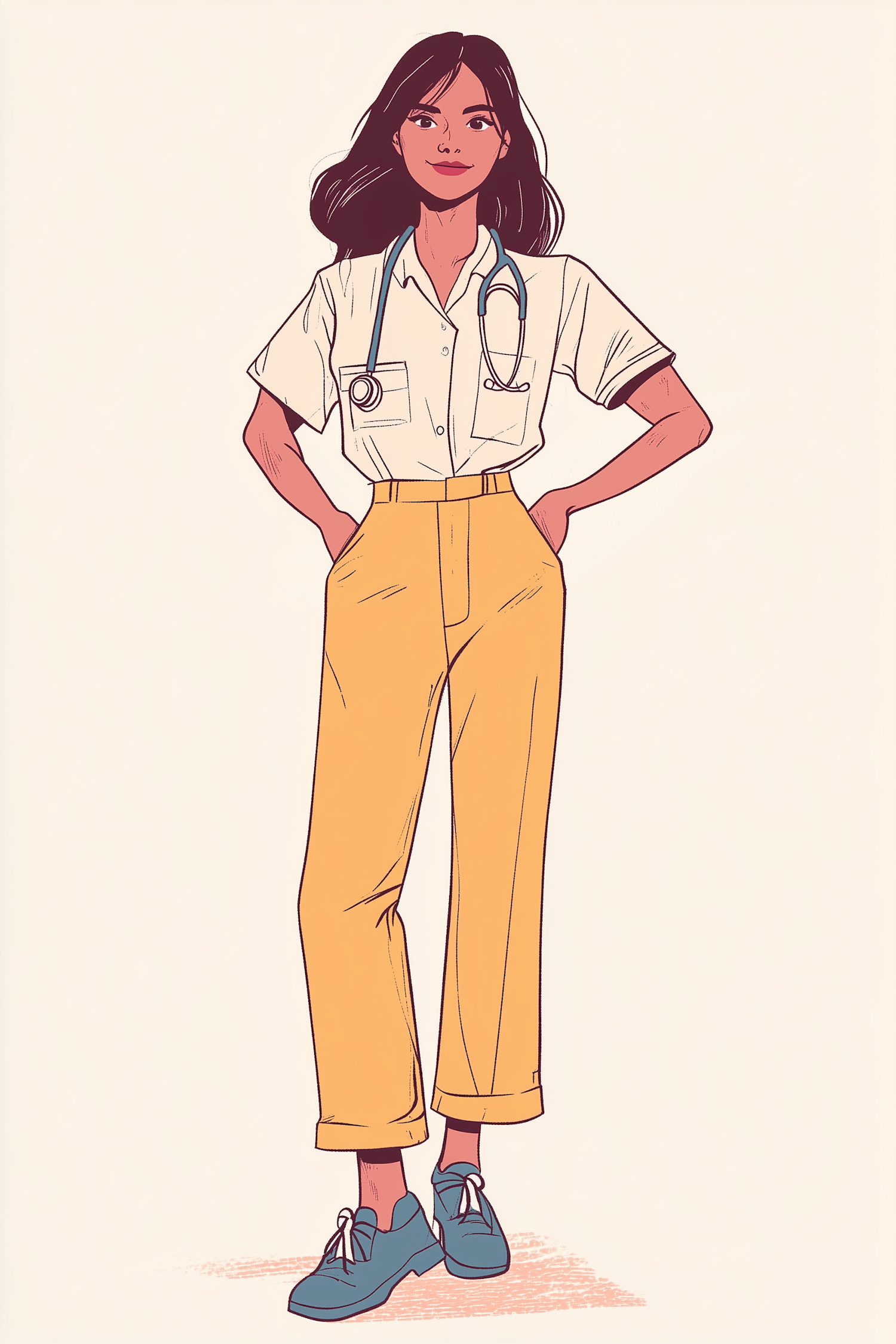 Illustration of a confident young Asian woman doctor with a stethoscope, wearing yellow pants and blue sneakers.