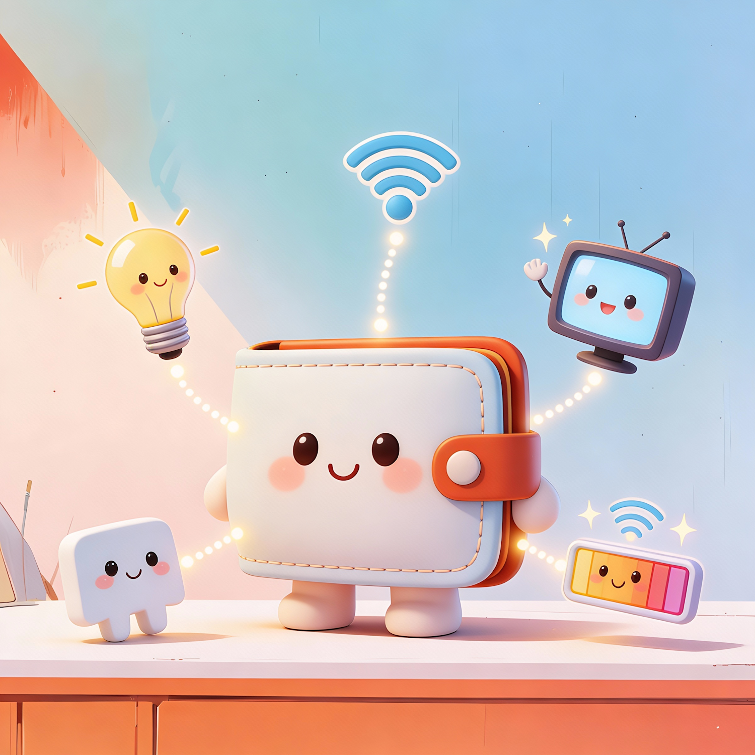 A cute illustration of a smiling wallet character surrounded by friendly objects like a light bulb, TV, and battery, symbolizing connectivity.