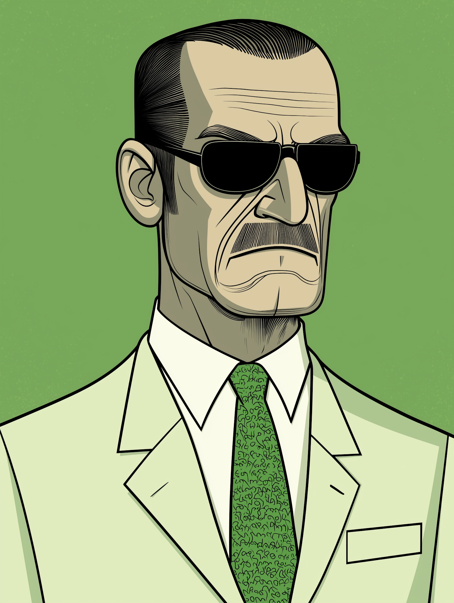 Stylized illustration of a man in a light green suit, dark sunglasses, and a patterned tie against a green background.
