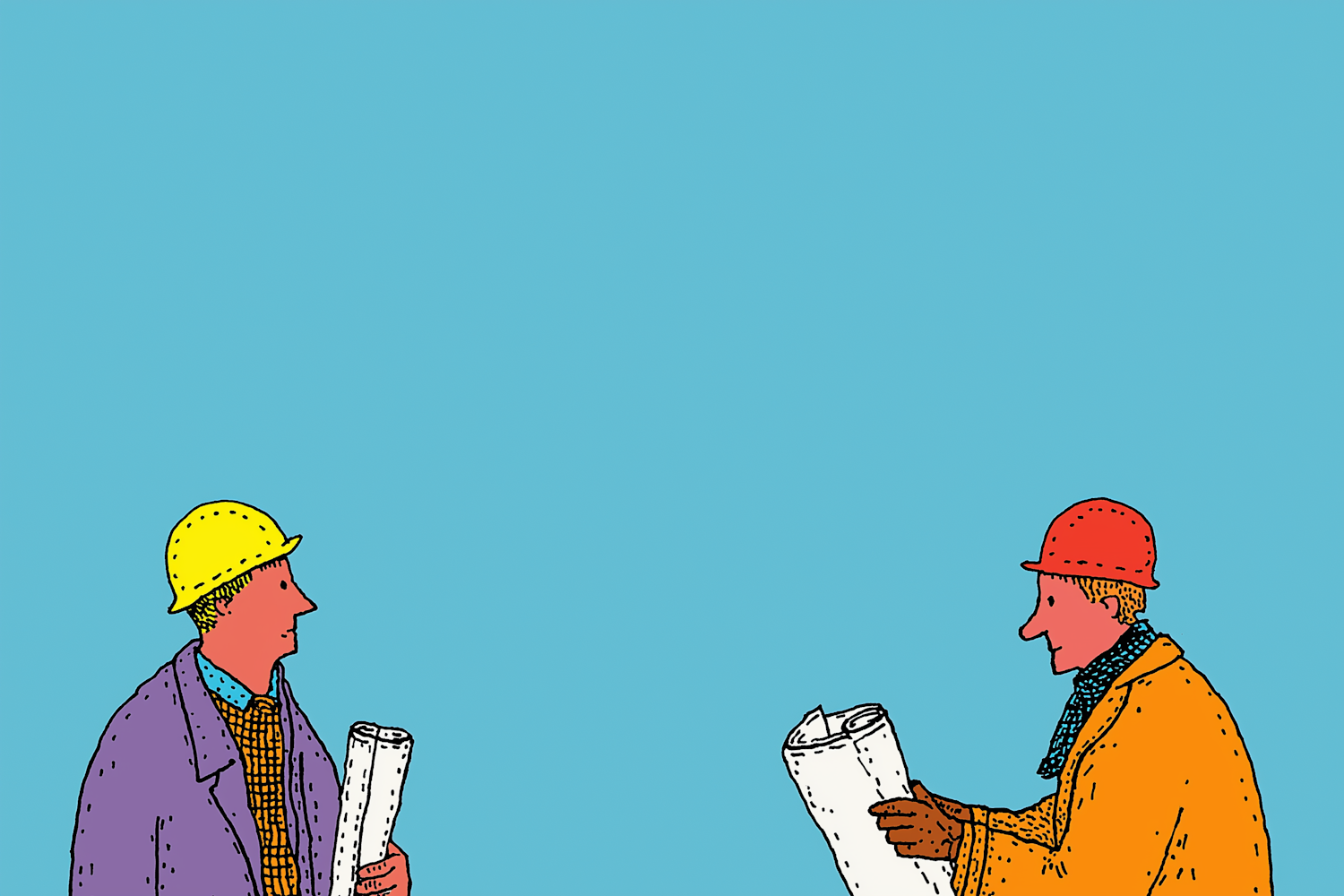 Cartoon illustration of two construction workers with blueprints, wearing colorful helmets and jackets, set against a blue background.