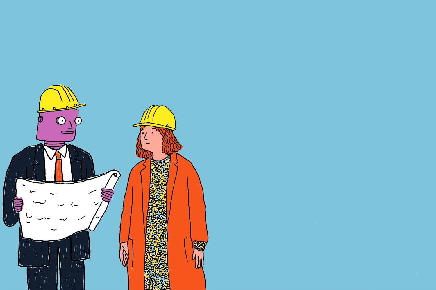 Illustration of two individuals in construction helmets discussing a blueprint against a light blue background.