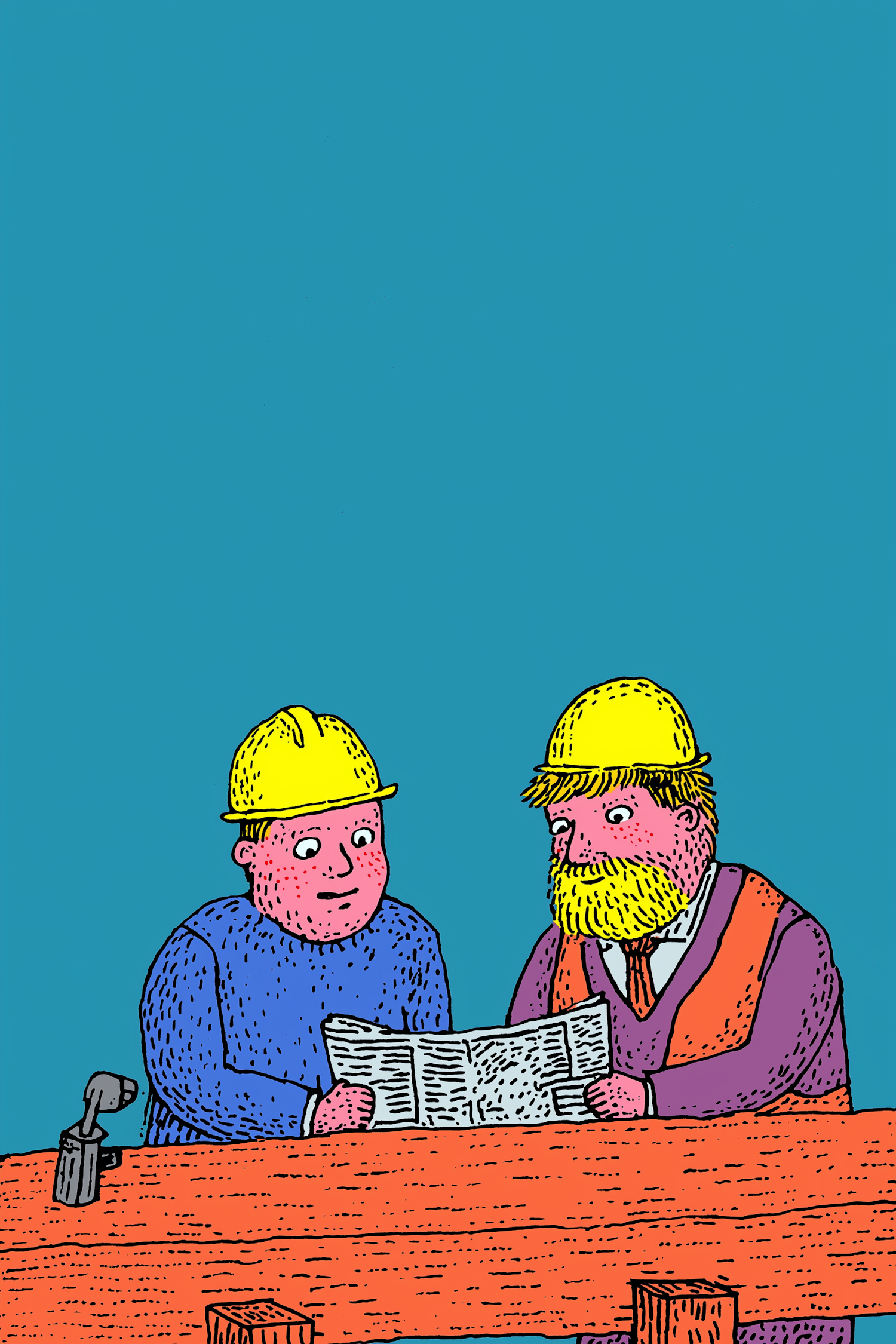 A vibrant cartoon illustration of two construction workers reviewing plans at a wooden table, set against a solid blue background.