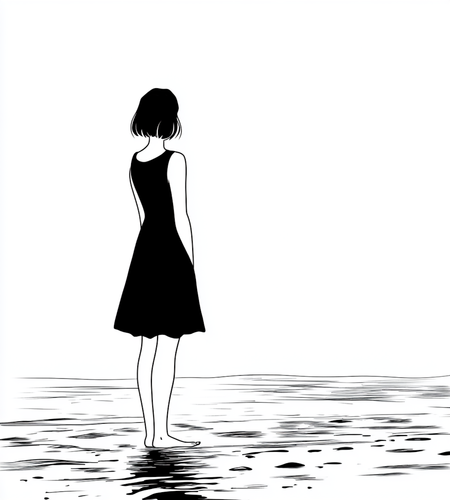 Minimalist black-and-white illustration of a woman in a black dress standing barefoot on reflective water, evoking solitude and serenity.