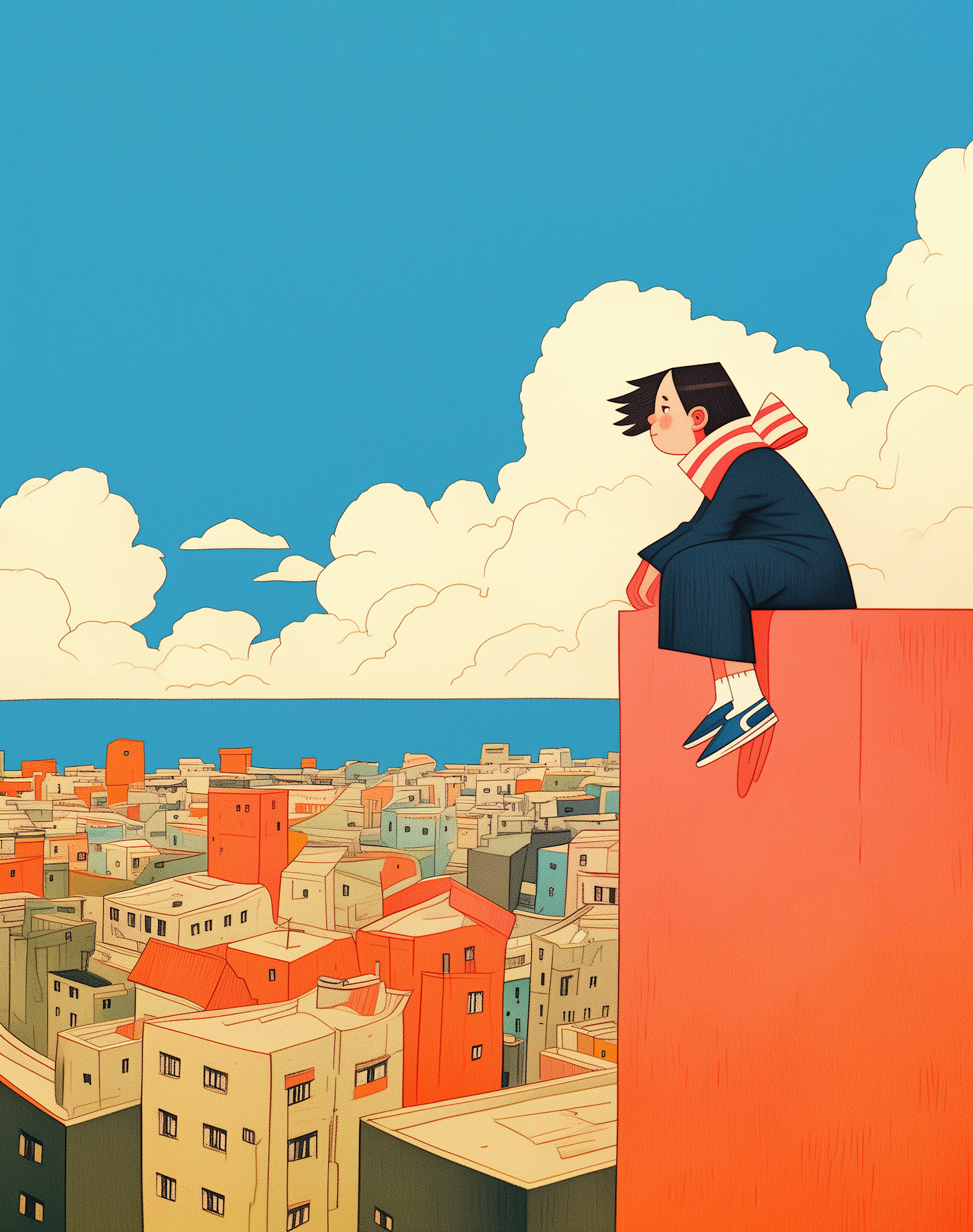 Stylized illustration of a person on a red building, overlooking a colorful cityscape under a clear blue sky with fluffy clouds.