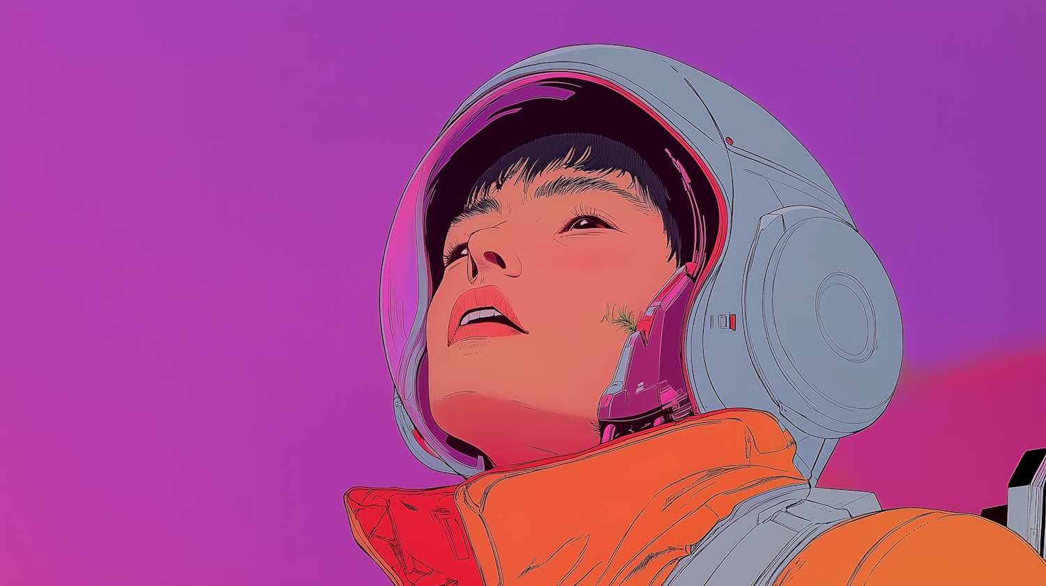 Stylized astronaut illustration with vibrant pink-purple background, futuristic helmet, and orange spacesuit, evoking wonder and exploration.