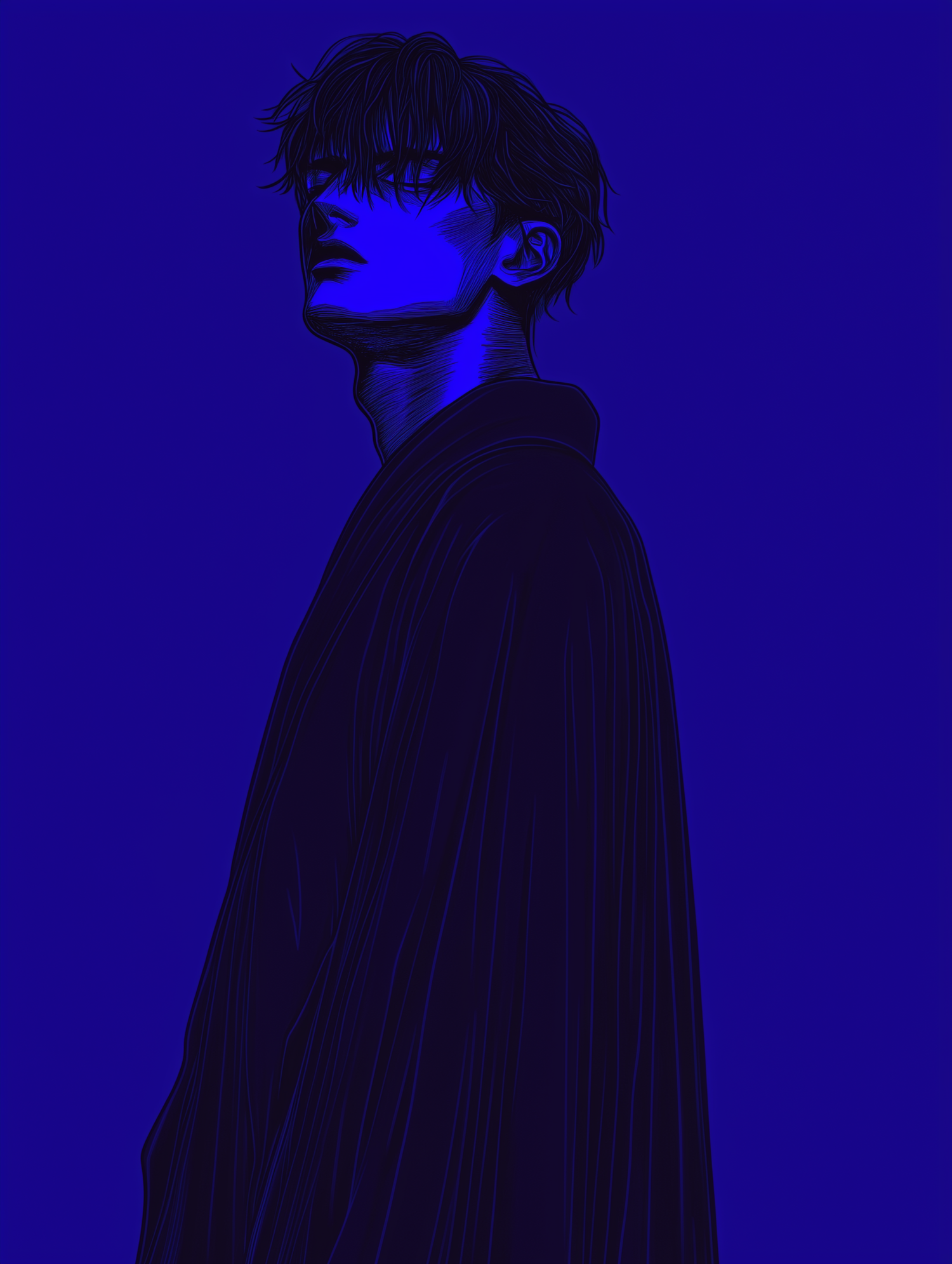 Stylized blue illustration of a person in profile, with tousled hair and a contemplative expression against a vibrant blue background.