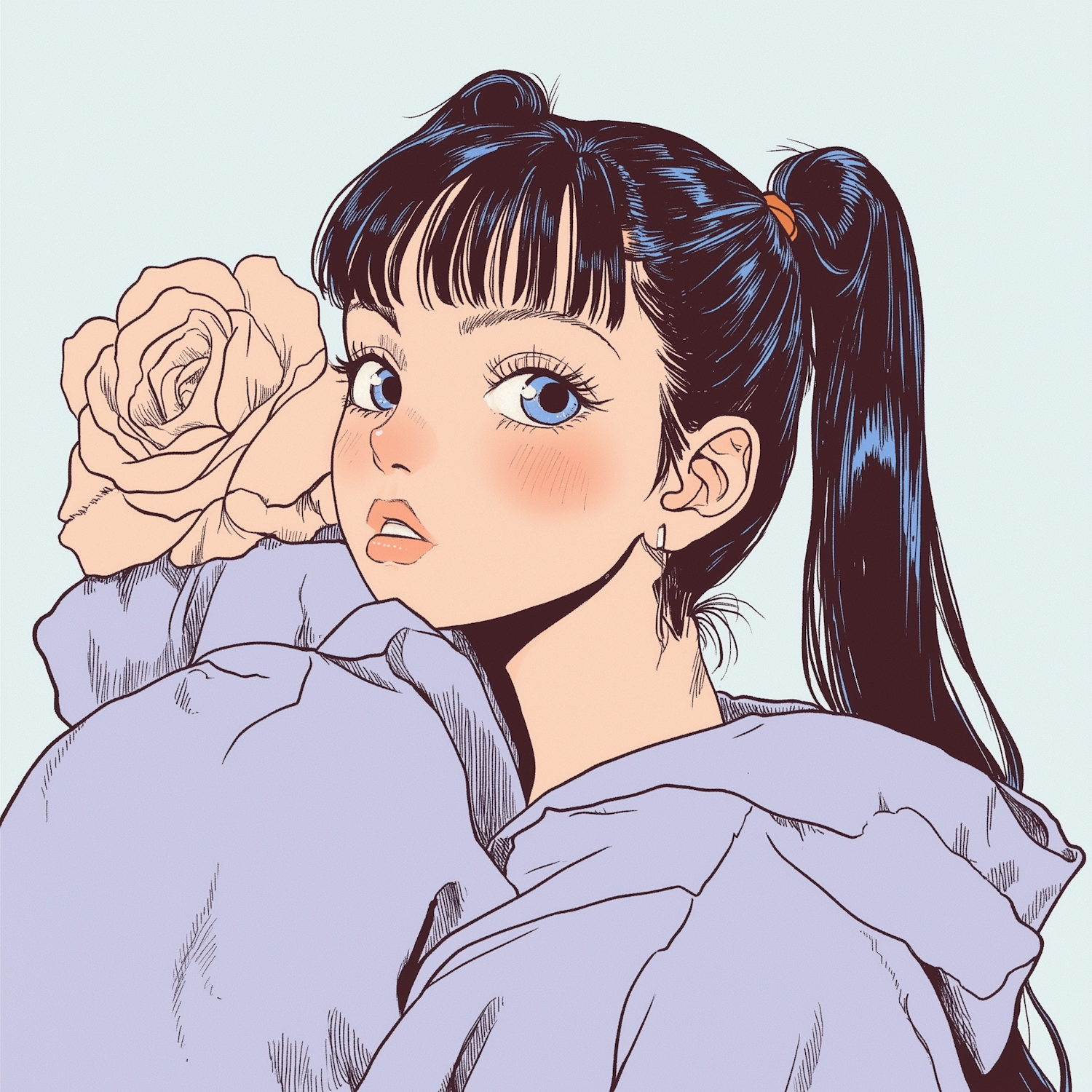 Stylish illustration of a young woman with blue eyes, dark hair, and a pale pink rose, wearing a light purple hoodie.