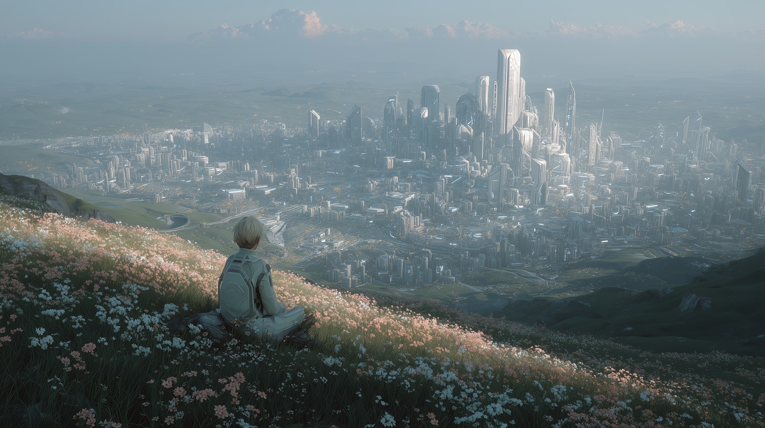 A person sits on a flower-covered hill, gazing at a futuristic cityscape in the distance, blending nature and modern architecture.